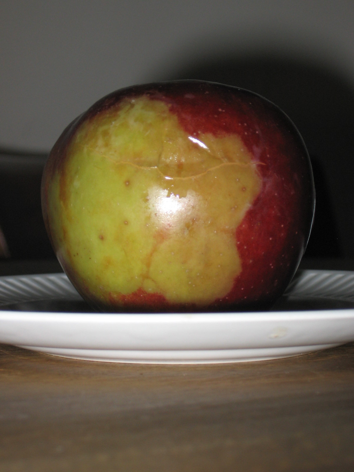 After doing my usual daily grocery shopping, I return home and as I am putting my purchases away, I notice that one of my Macoun apples is moist. As it turns out, the apple is perfect on one side – the side that drew me like metal to magnet, and rotting mush on the other. I debate what to do, take the time to return it, or just be philosophical about it. Hey, sometimes it’s just your turn to purchase The Rotten Apple.