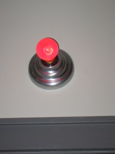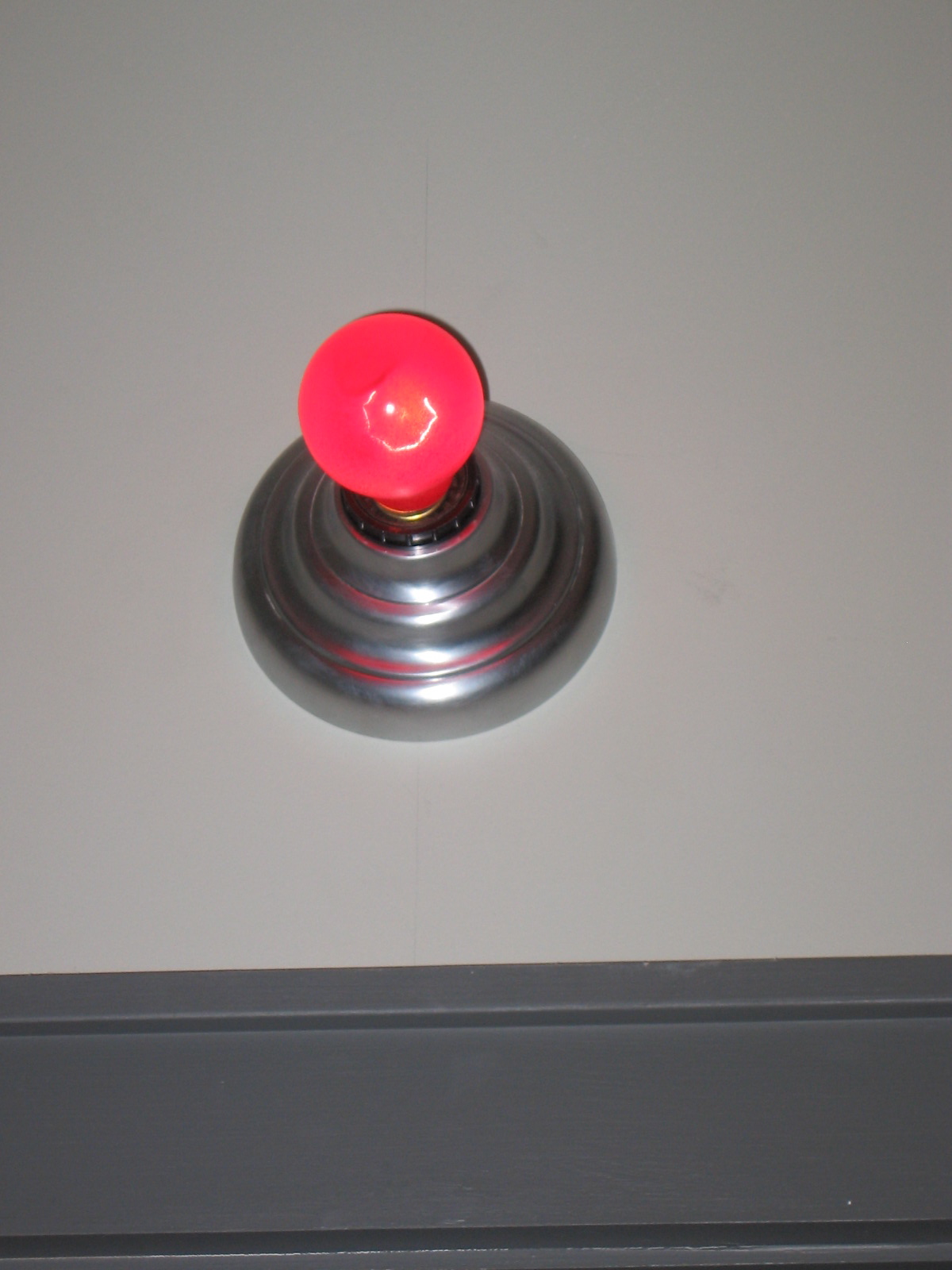 One of Elsbeth’s most inspired creative feats, at least amongst her staff, has been the red light in our office that she had the company craftsman install a few years ago.  If I recall the root of Elsbeth’s inspiration, it was her very own bladder after gulping down yet another 20-ounce bottle of Diet Coke.  When this light bulb is lit, this notifies us when our bathroom is occupied.  This is great since our bathroom is inconveniently located outside our office in our department’s warehouse.  That light bulb was truly another stroke of Elsbethian genius.  Prior to its existence, often one would trek through the warehouse, over to the bathroom, only to find the door shut, forcing the outsider to make a decision, do you wait or return later?