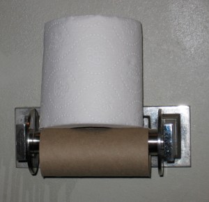 Back in the office, I immediately show the picture to my colleagues, Greg, Elaine and Ling.  Both the Quiet Man and Elsbeth are on the phone so they’re spared.  Greg is quite sure that The Company Blockhead was the culprit.  One of the requirements for anyone working under Elsbeth is that your signature is not your thumbprint.  Therefore, this does appear to be the handiwork of the love child of a small soap dish and a tree stump.  An old adage claims that a picture is worth a thousand words, but I deduce that the positioning of this toilet paper roll rates just eleven more: