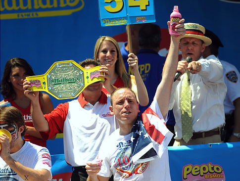 Without having a fellow elite eater in his midst, Chestnut, who devoured 68 hot dogs and buns (or HDBs in competitive eating jargon), in ten minutes last year against Kobayashi’s 64 ½, gave a performance screaming, “diet!” on Sunday.  He ate a mere 54 HDBs.  Chestnut’s goal is to eventually eat 70 HDBs, but that might be hard for him to reach without a competitor of Kabayashi’s caliber and twenty pound stomach capacity to spur him on.