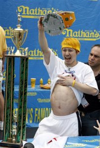 Possibly, Milton would have been more entertained had he switched the channel to that American tradition being broadcast live on ESPN, Nathan’s Famous Fourth of July International Hot Dog Eating Contest, sponsored by Pepto Bismol.  Viewers tune in hoping to see a competitor vomit, the exact reason why I tune out.  Odds are good that Milton would have found this monument to competitive eating boring as well since the reigning champion Joey “Jaws” Chestnut could not compete against his archrival, Takeru “The Tsunami” Kobayashi, of Japan.  These two are the titans of the competitive eating world, the overeating equivalent of Federer and Nadal.