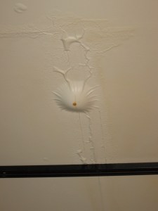 I look up and see an appalling protrusion that bears the distinct resemblance to an adolescent girl’s breast but with a weeping nipple.  I don’t know whether to vomit, put a bra on it, or photograph it. She’s positioned a tall garbage can under the leak to catch the rust color drip.