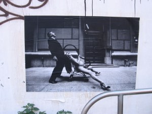 Thursday evening, I left work with my friend and colleague, Ling. As we were walking down Varick Street, I was yammering knowledgeably about a topic in which I am an expert, a topic I now completely draw a blank on, but possibly it was about the failing memory one struggles with in one’s middle years, when a provocative black and white photo plastered over a graffiti defaced wall caught my eye. I almost threw my neck out looking at it.