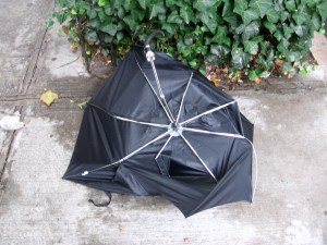 Almost as soon as you open one of The Umbrella Man’s umbrellas, if there is as much as a Chihuahua’s sneeze in the air, it will instantly blow inside out, so you can imagine how sturdy they are under gale force wind.  It has occurred to me that these umbrellas might blow inside out if opened under a sunny blue sky, simply because there is an umbrella industry conspiracy in play here.  The conspiracy is that The Umbrella Man’s umbrellas are purposely designed to blow inside out to ensure that customers will either buy more umbrellas from The Umbrella Man, which could be another definition of insanity, or just before these users commit themselves to a mental institution, these same customers – people like me – break down and invest the equivalent of a one way plane fare to New Orleans on JetBlue in a top of the line umbrella instead.  Also, if I were inclined to visit New Orleans this time of year, it would probably behoove me to pack my performance-enhanced umbrella.
