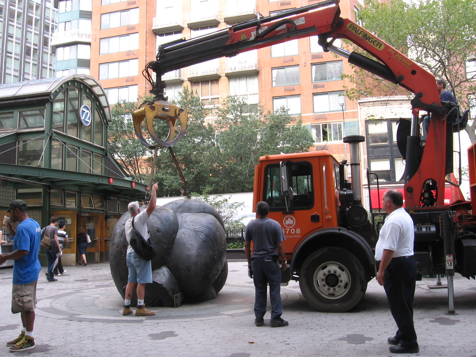 Earlier this month, on a Friday when I was on my way to work, I saw a large construction crane outside the 73rd Street entrance of the 72nd Street 1, 2, 3 subway station.  A worker, with the thankless job of directing foot traffic, was shouting repeatedly to everyone trying to enter the station, “Stay to your left away from the monument!”  A defiant elderly woman shouted back at him, “Why should I?”  The worker gave this (likely) native New Yorker a weary look.  Grumbling about how her tax dollars are wasted, she stayed to her left.