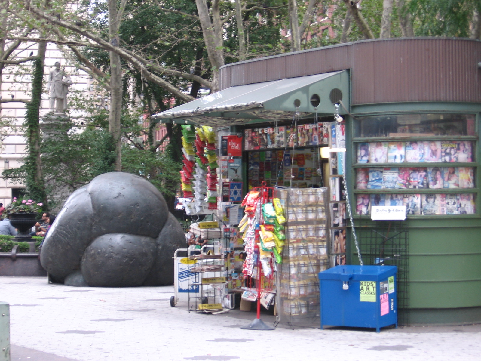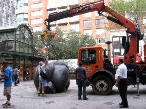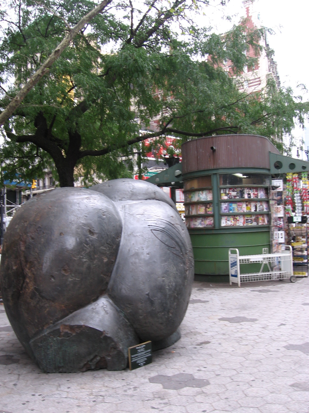The monument the worker was referring to is the Manolo Valdés sculpture Odalisca (2006), which has been on display as part of a public arts project up and down Broadway since May that lasts through January.  For more details about her installation see Lame Adventure 46: Free Art on Broadway.