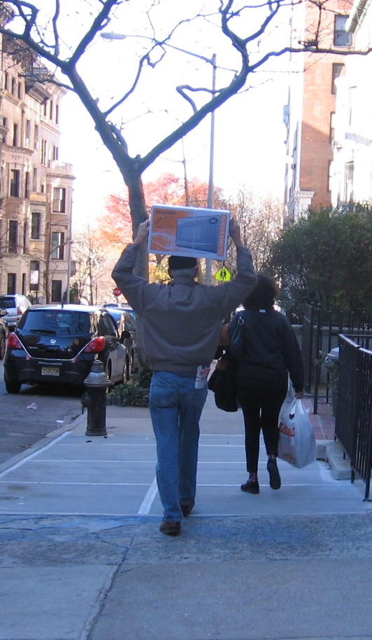 During my stroll I was distracted from my pain by a guy walking ahead of me wearing a beret.  He also happened to be carrying a toaster oven box on his head.  Since his companion was carrying a shopping bag from Zabar’s, a store that also happens to sell toaster ovens, I was confident that there was an actual toaster oven in that box atop that guy’s head.  I also suspected that they were unable to find a parking space closer to Zabar’s.  As I watched Beret Man, this thought crossed my mind: