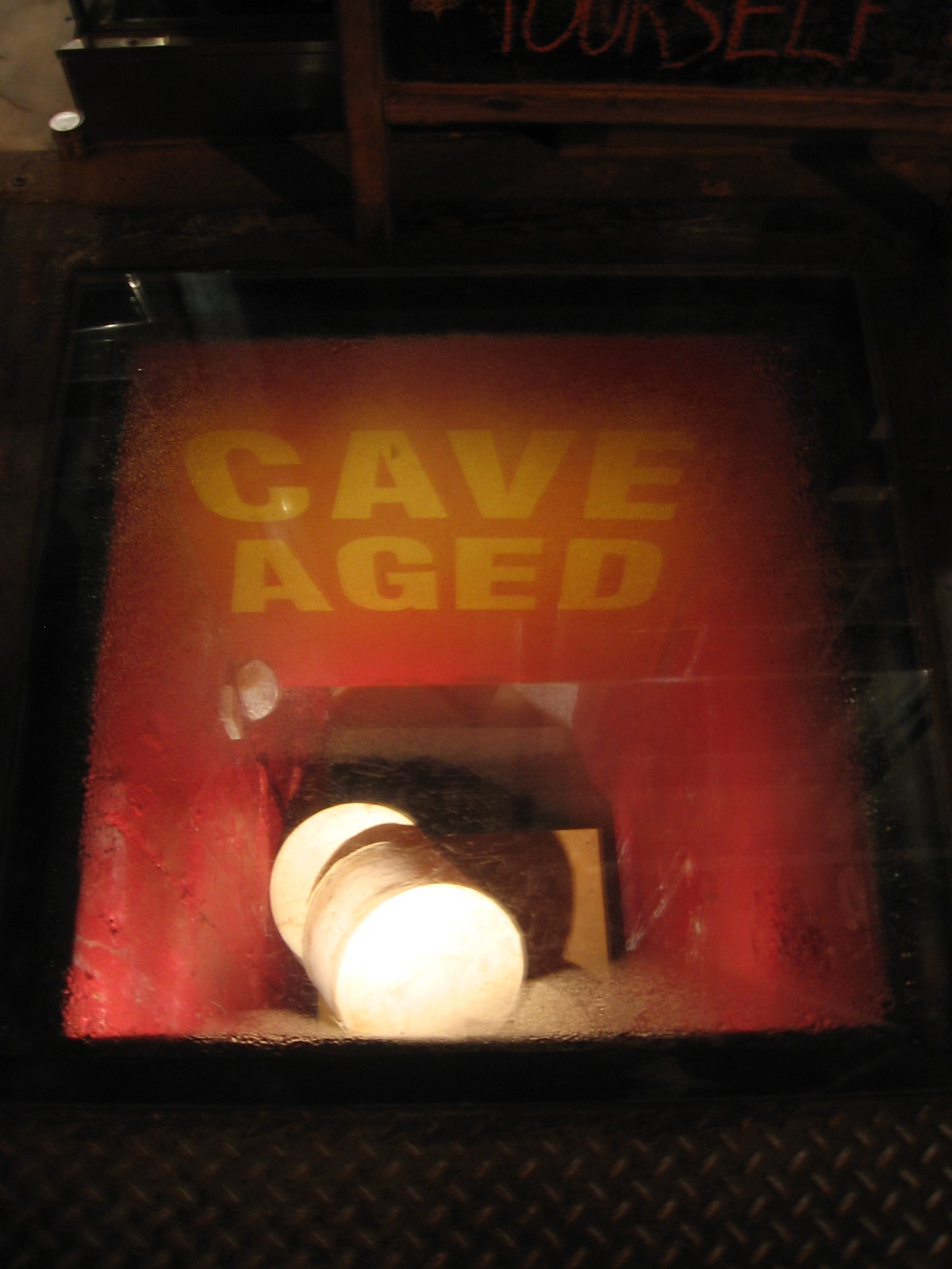 To escape the freezer-like temperature, we duck into a bodega where Albee whips out his smart phone and conducts a search.  He comes up empty.  Back on Bleeker Street, as we’re walking past Murray’s Cheese Shop, we see a display embedded in the sidewalk of caved age cheese, something neither of us has ever noticed before.