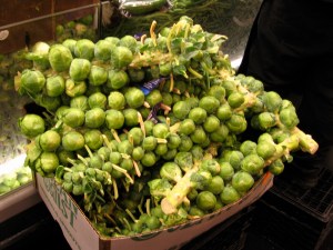 Earlier this week I was food-shopping in Fairway when I saw they had stalks of Brussels sprouts.  “Oh happy day!” I gushed to myself.  This is not a very common occurrence.  Just as some may dream of designer clothes, swanky sports cars, or other hard to attain bling, I am so steam rolled by this dismal economy I prefer to keep my fantasies in check.  Therefore, I muse about finding cheap theater tickets, Tom’s toothpaste on sale and food.