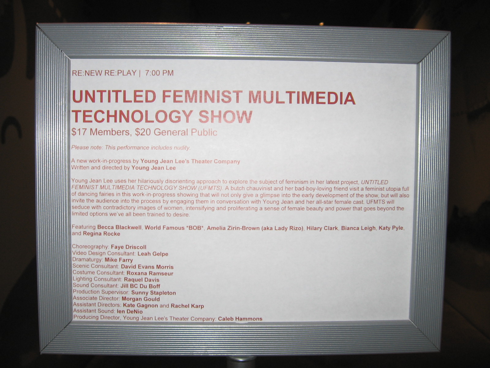 Meanwhile, Young Jean’s work remains as original, challenging and edgy as ever.  Her subjects range from religion (Church), race (The Shipment), her take on Shakespeare’s King Lear (Lear), to now, feminism.  I am certain that she could create a theater piece around a can opener and we would find it provocative.  Her latest, a work-in-progress called, Untitled Feminist Multimedia Technology Show, recently played for four days between December 16th through 19th at the New Museum.
