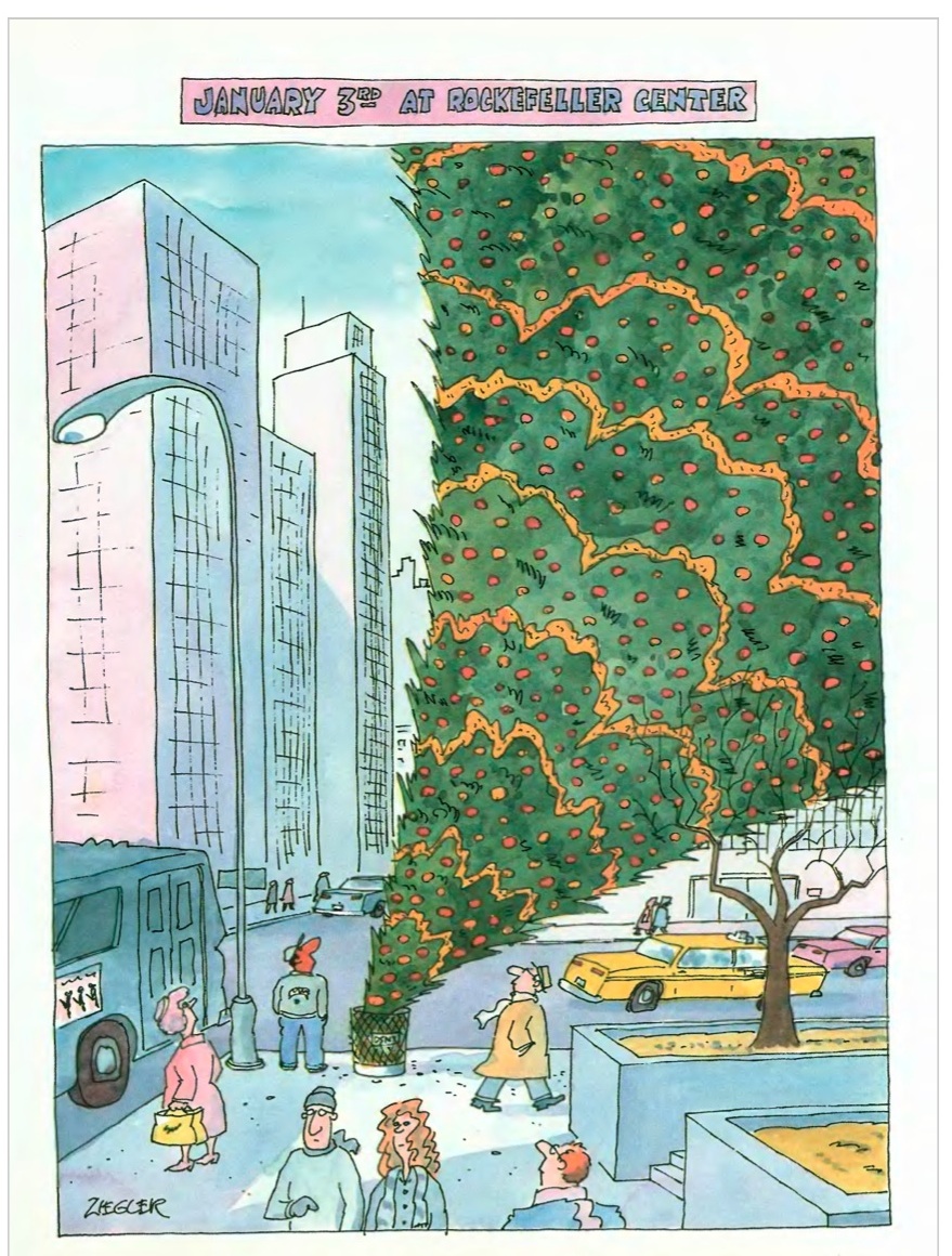 At the risk of encountering the wrath of The New Yorker and a beating from the angry ghosts of Harold Ross, William Shawn, and their current fire-breathing legal department, pictured below is one of their more profound cartoons by Jack Ziegler that perfectly captures the post-holiday spirit.