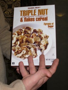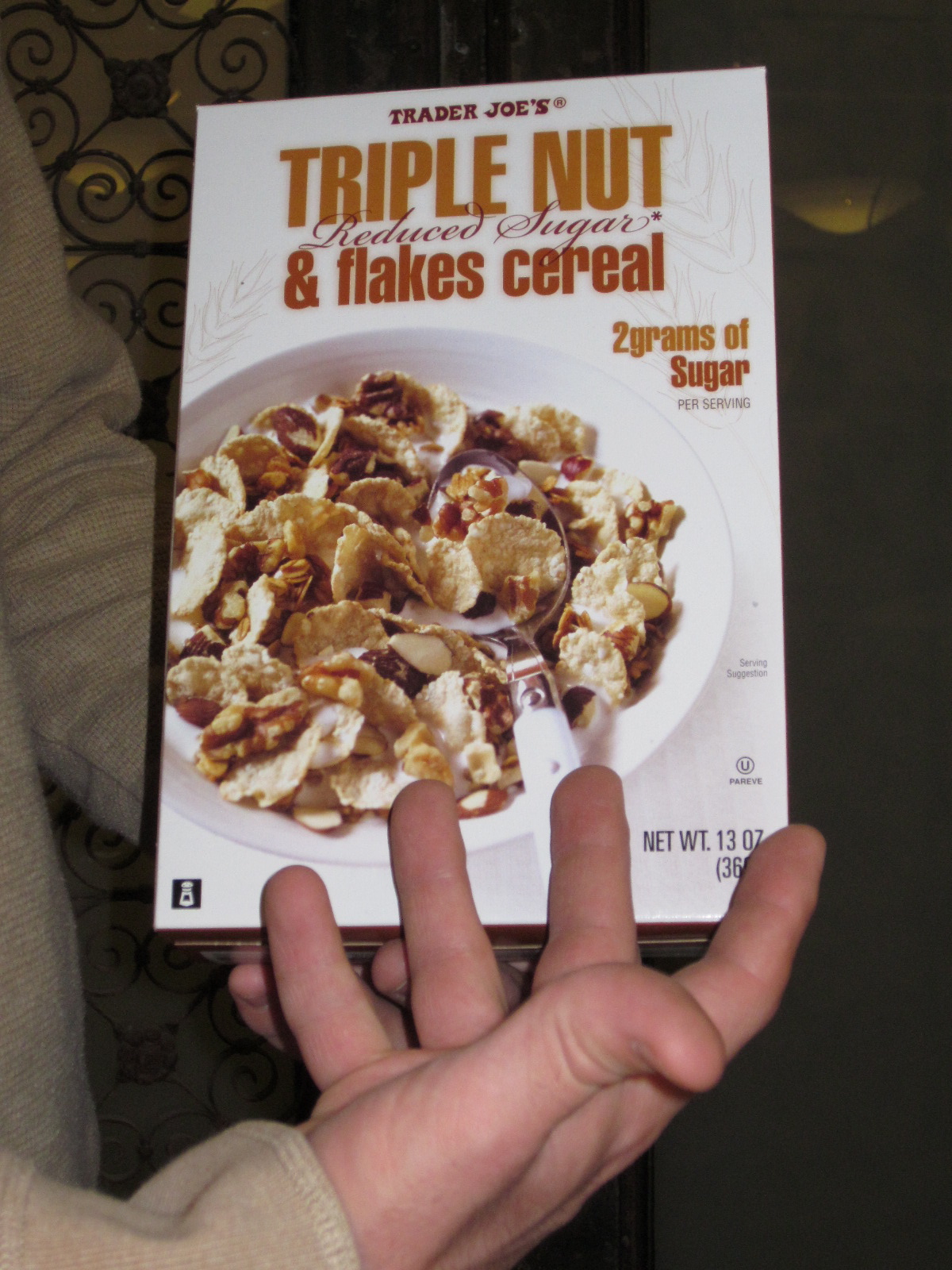 That afternoon, they were simply reduced to piles of tree corpses that were of no further use to their owners.  Most New York City apartments are tight on space, so the average resident is not going to be inclined to compost his or her tree.  Last week, I tried a new Trader Joe’s cereal containing a key ingredient that could have been mulch.  I gave it to my sidekick, Greg.