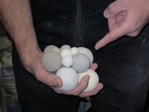 Since it seems like almost everyone I know was born within a five-day period in February, today, my sidekick, Greg, is off celebrating, or whatever it is he’s doing for his Valentine’s Day birthday.  For all I know he could be home in Brooklyn passed out in bed with his two cats until four in the afternoon, or he could be plastering the country with his resume.  It’s his day to do whatever he wants.  When I find myself walking past the Greg-less workshop today, I will likely glance at his leftover grout ball collection.