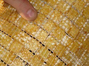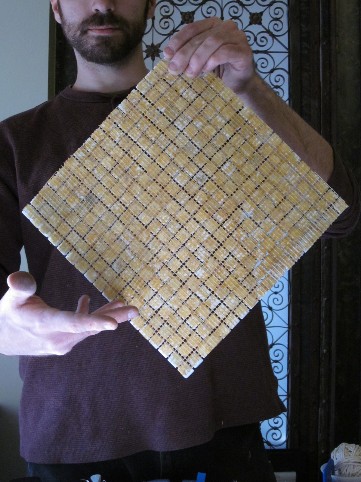 Standing before me my right-hand-and-left-middle-finger-man proudly displayed the thick coating of dark orange glue saturating a sheet of mesh-mounted mosaic.