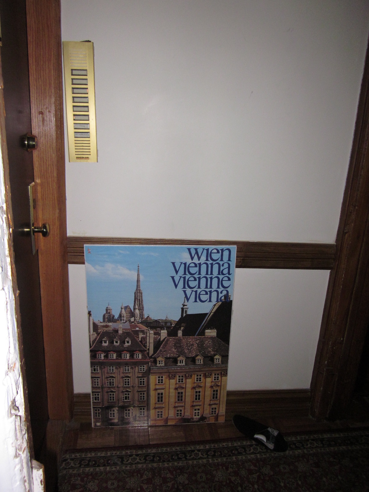 I do not know the significance of the Vienna poster, especially since he is Greek from Greece.  Possibly the felt slipper was added for amusement – certainly not mine. As for the inoperable intercom he has now plastered to the wall, I am sure that our landlady, Cruella LeGree, will fleece him for defacing the premises when the time comes for him to move out.  Then, I might have a hearty chuckle when she smacks him with that charge.