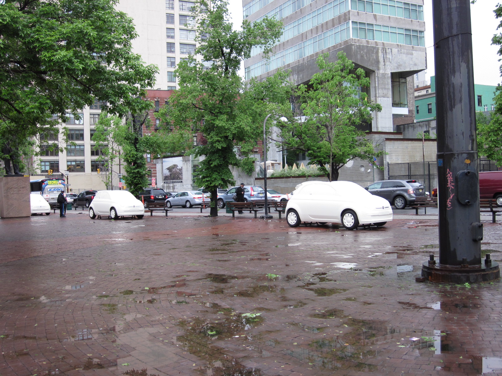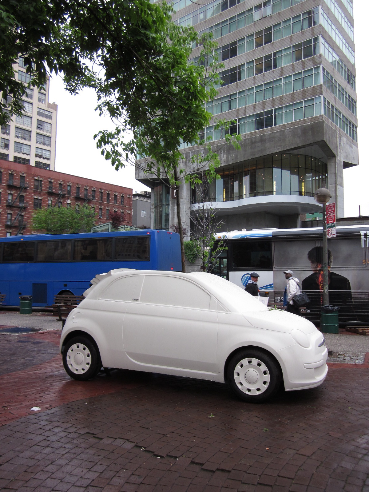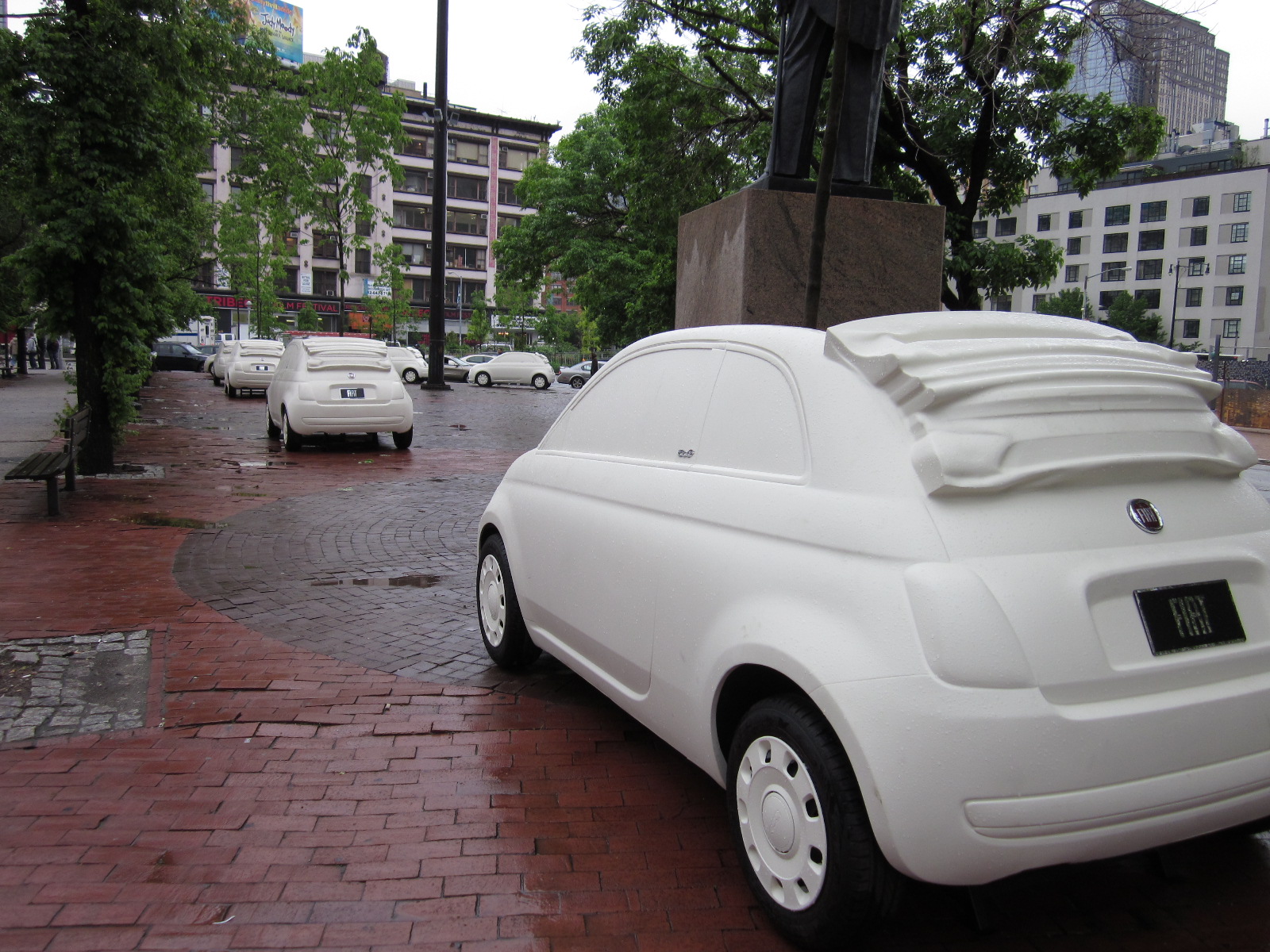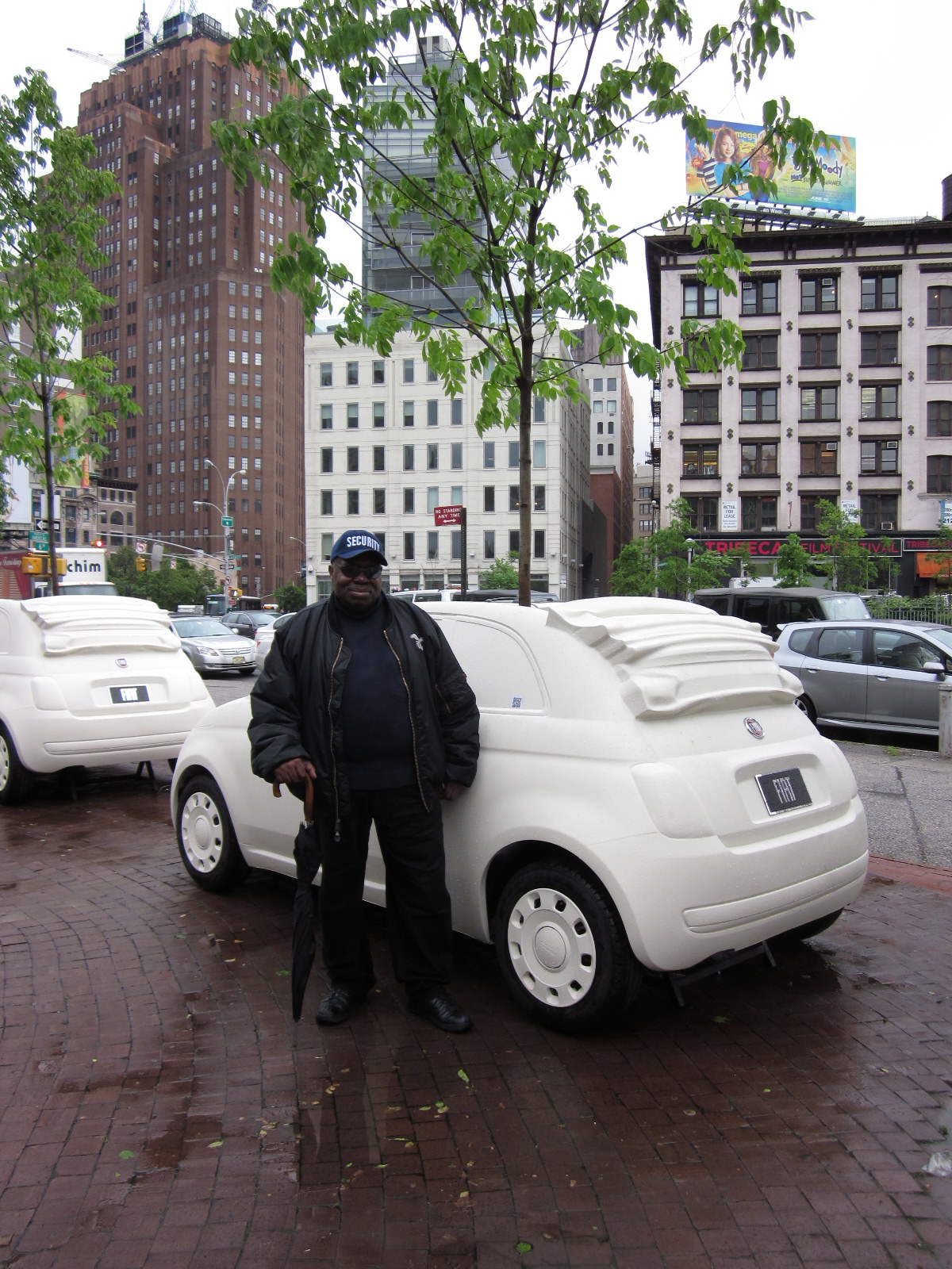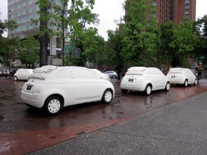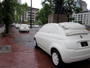 When we got up front and personal with the fiberglass replicas of this whimsical little car, the Fiat 500C, I experienced a Proustian-style sense memory of the white almond wedding favors my mother and grandmother would spend days of their lives wrapping in tulle. My only participation in this ritual was to taste-test a few of the almonds. Since this installation was guarded, I resisted the urge to take a bite out of a fender. That would surely classify as “something stupid” requiring Carl the Helpful to spring into action.