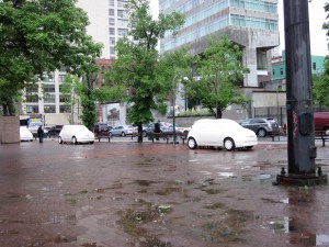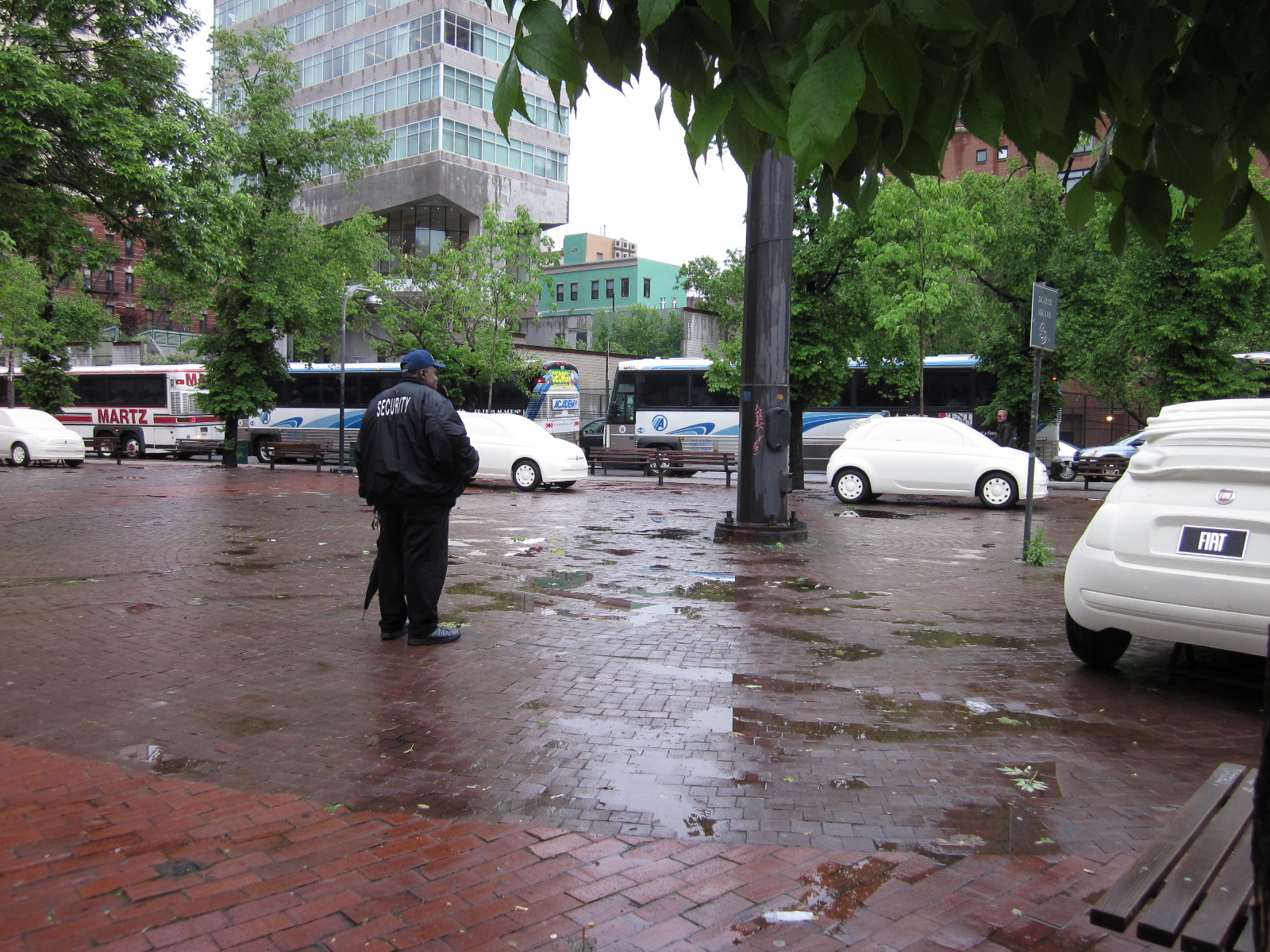 He is currently working as a security guard this wet and rainy week in Duarte Square located on Avenue of the Americas at Canal Street in lower Manhattan. He’s one of the guards making sure that nothing stupid happens to an installation by designer and architect, Fabio Novembre, that was originally called “Per fare un albero” (“To make a tree”) when it was first displayed in Milan in 2009. This installation has also visited Rome, Paris and Madrid.
