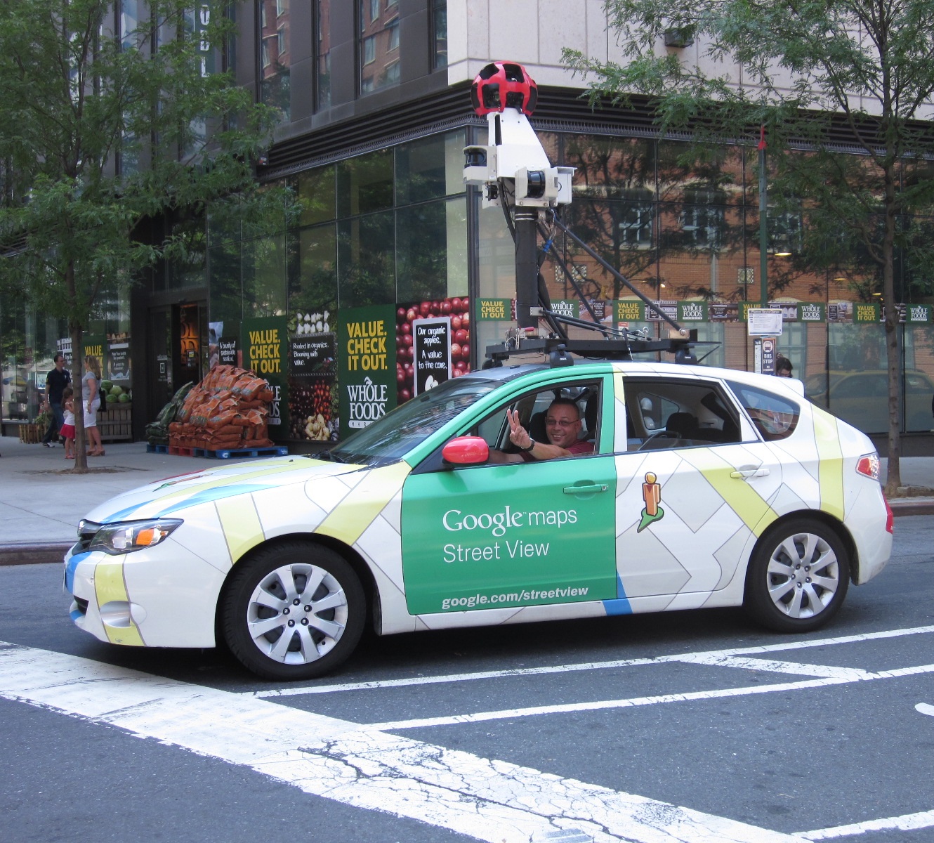 I was in Tribeca walking down Greenwich Street en route to Whole Paycheck mindlessly thinking about whatever it was that I was mindlessly thinking about at that moment, probably the usual — food or sex or did I remember to turn off the iron. As I was approaching the intersection at Greenwich and Warren Streets I suddenly saw the elusive Google Maps Street View car for the second time in less than two weeks. Click here to read about my first encounter with this exciting vehicle.