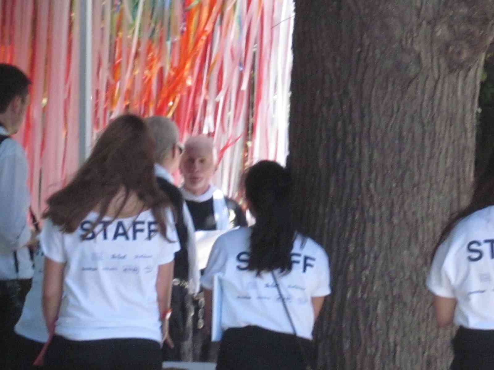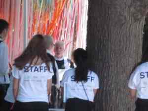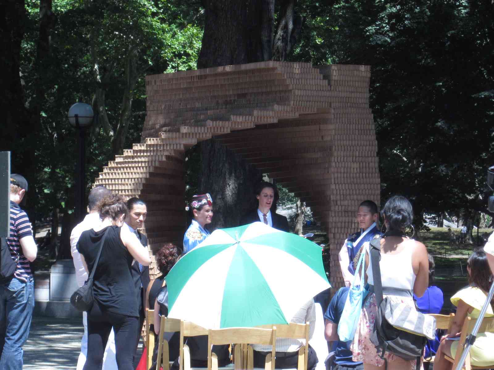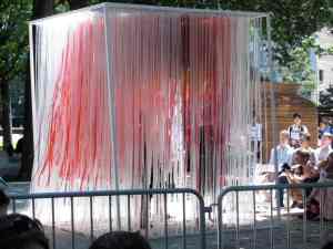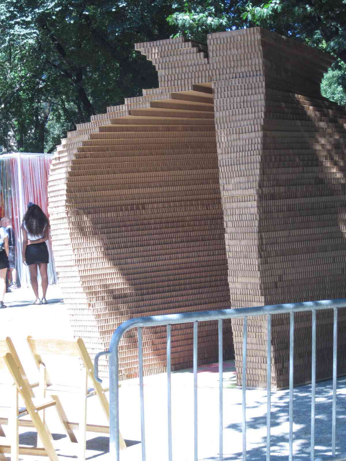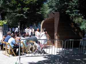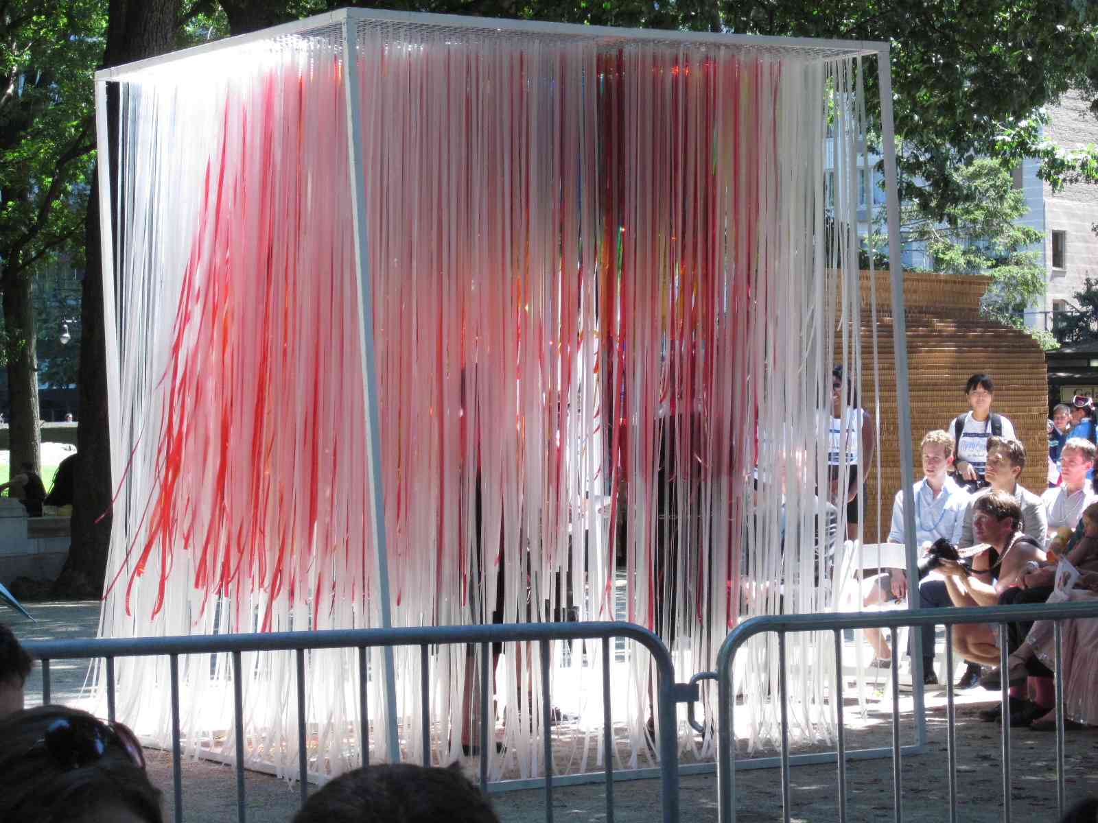 The two chapels were selected from 56 design entries.  Two of the stipulations were that these chapels had the capacity to be constructed within two hours on the morning of the event, and they measure no more than eight by eight feet.  The winners were Kiss by Z-A Studio and a cube of rainbow ribbons by the design firm ICRAVE.  What I liked most about Kiss, aside from the simple elegance of the design, was that when separated, the two pieces could not stand alone.  Gee, if I was the sappy type, I might have popped a tear when I wrote that.