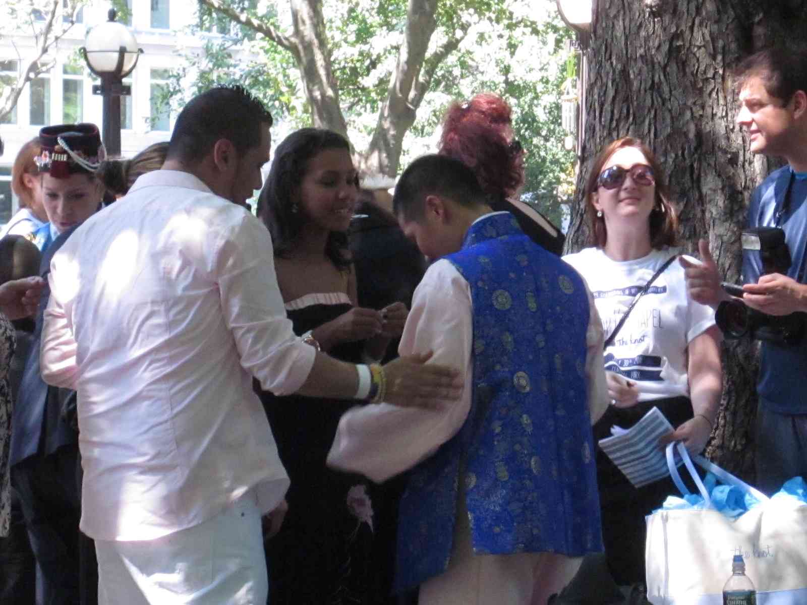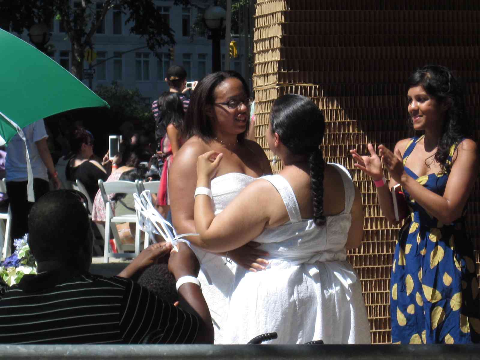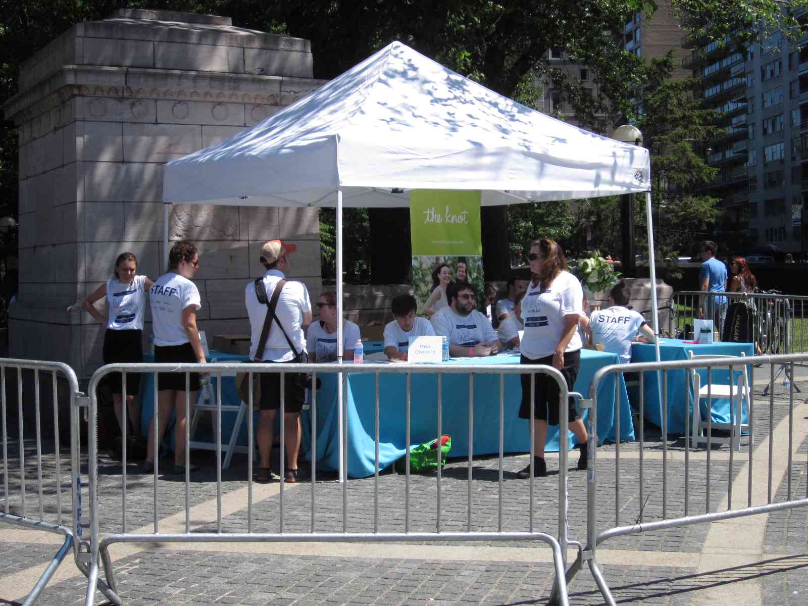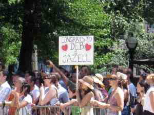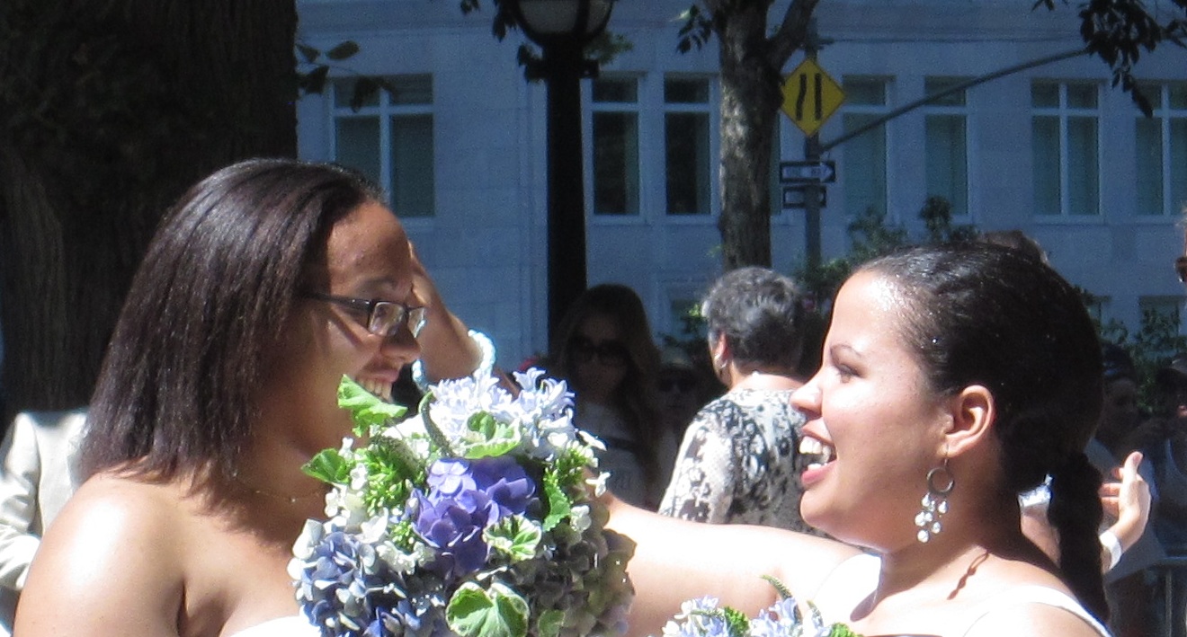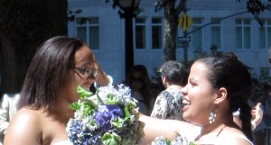 Today is a lovely 91 degree day in the city – hot but not humid, and a perfect day to get same-sex married in one of the two pop-up chapels near Columbus Circle at the Merchant’s Gate entrance to Central Park.  The area seemed equally divided with well wishing onlookers as well as police and wedding staff.
