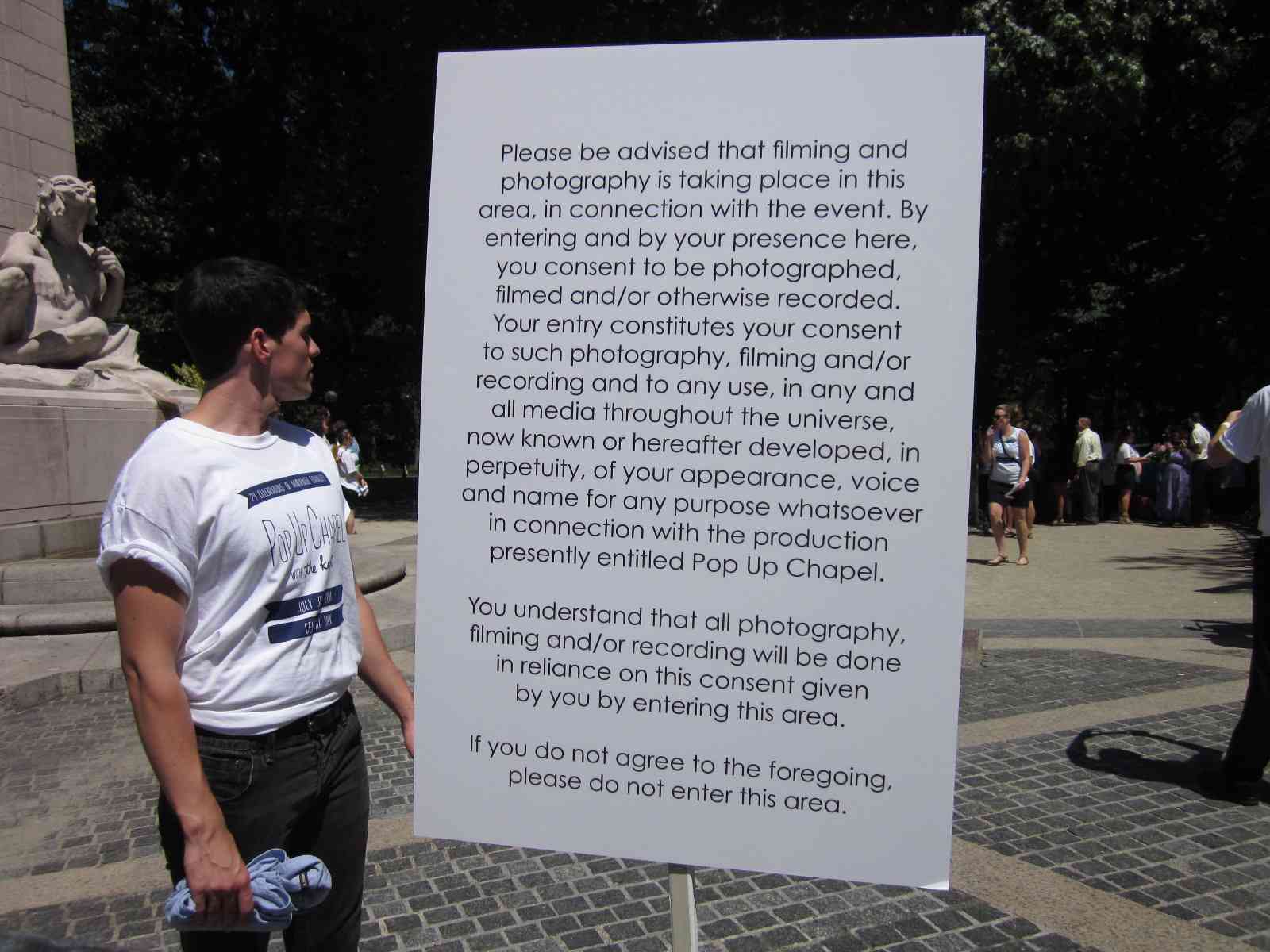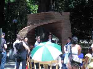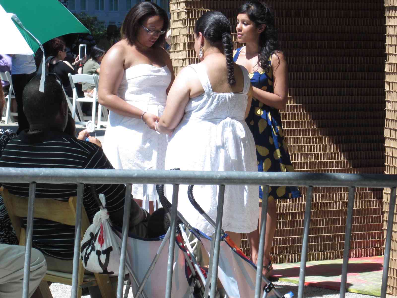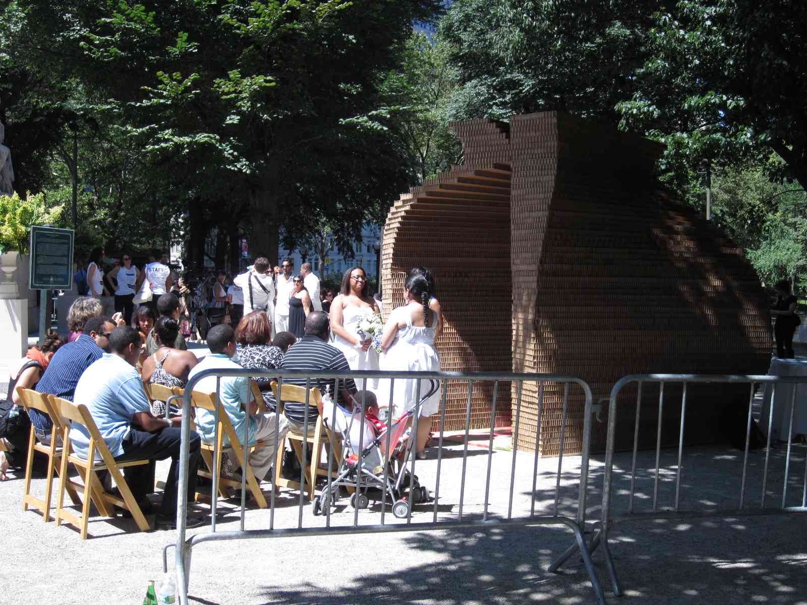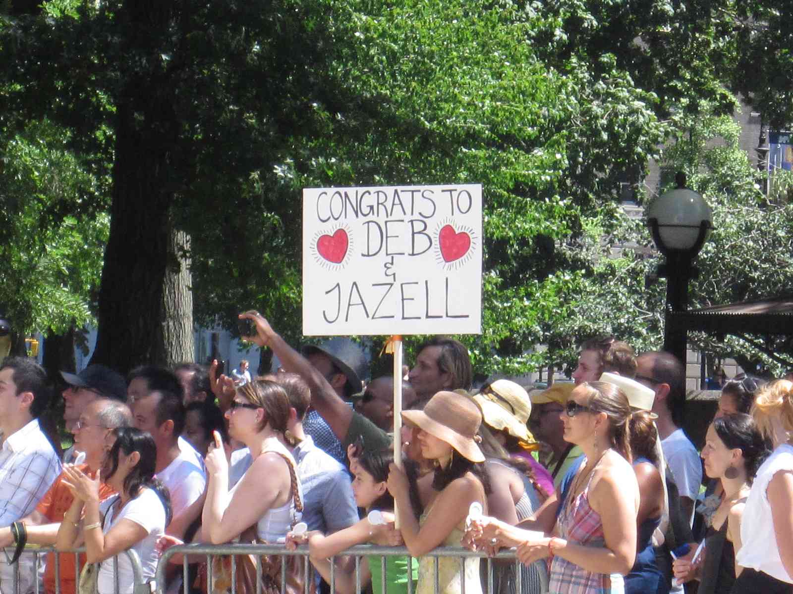 Today is a lovely 91 degree day in the city – hot but not humid, and a perfect day to get same-sex married in one of the two pop-up chapels near Columbus Circle at the Merchant’s Gate entrance to Central Park.  The area seemed equally divided with well wishing onlookers as well as police and wedding staff.
