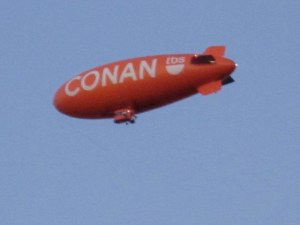 Back to the blimp, whenever I see an interesting site I whip out my camera and photograph it.  This air ship qualified as a site worth shooting.  When I zoomed in I realized that it was The Conan Blimp.  Conan O’Brien is taping his talk show this week in The Big Apple.  There is a web site dedicated to Conan’s blimp since basically there seems to be a web site dedicated to practically everything short of my socks, but I have been known to write about those here.  I was not aware of this blimp or its web site until I Google searched “conan blimp” and got 293,000 results in 0.16 seconds.