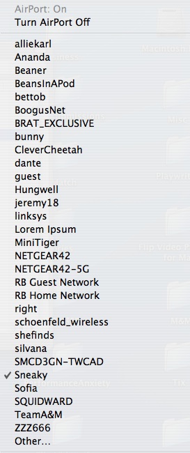 Finally, I’d like to know where the computer users around my cave acquired their wireless network names.  Specifically, I’m thinking about bettob, BoogusNet (I’d be inclined to wash my hands if I tried to piggyback off that network), right, and shefinds.   Really, folks, those are the most inspired names that crossed your minds?