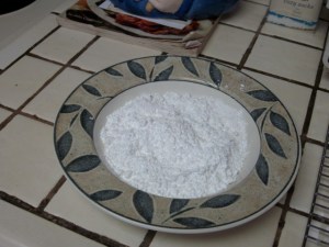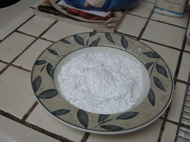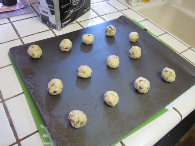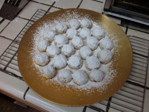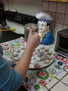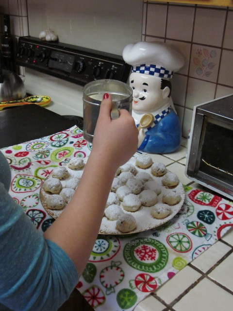 Snowballs, also called Mexican Wedding cookies or Sandies (a name preferred by our late grandmother, Vesuvius) are my favorite.  Sweet Pea is baking those first.