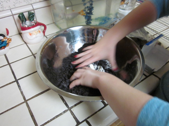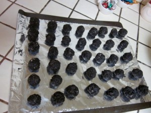 Then, Sweet Pea made her own favorites, Oreo Truffles.  Just smash a package of Oreos to smithereens, mix in a brick of cream cheese and refrigerate for two hours or freeze for 45 minutes.