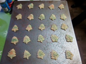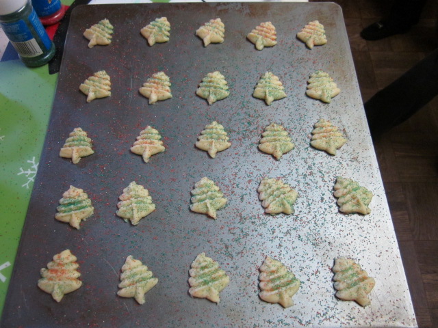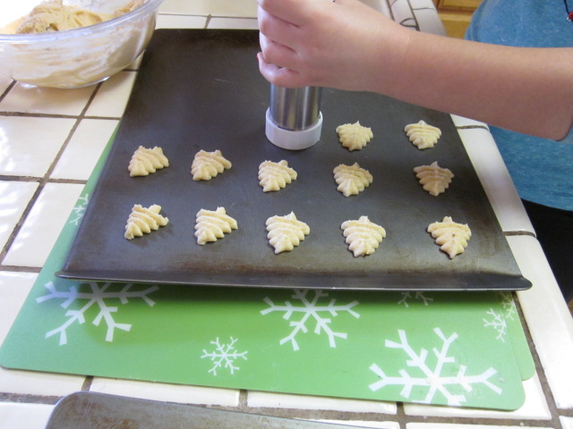 After baking the snowballs Sweet Pea moves onto another holiday hit, press cookies in the shape of Christmas trees.