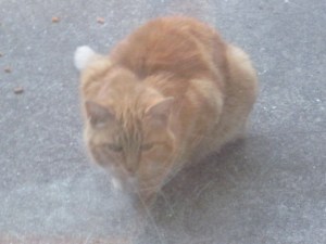 Outside cat taunting Thurber, "Hey Big Dumb Wuss!"