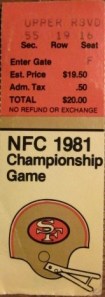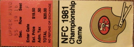 Although I am not very sentimental, when I moved to New York in 1982 to earn my BFA in Film at NYU(seless), one of the mementos I packed that I have saved through the years is this ticket stub from January 10, 1982 when I was in Candlestick Park watching the 1981 NFC Championship Game between the 49ers and the Dallas Cowboys.