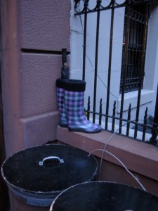 When I returned to my sanctum sanctorum to pick up Coco’s birthday gift* and head downtown, I noticed that The Trash Phantom had visited my building while I was out.  The Trash Phantom is That Wily One that leaves  junk prominently displayed within close proximity of the trashcans without putting said junk actually inside the trashcans.  The Trash Phantom must deem this junk as having value to some schnook passing by in this neighborhood, where the average resident earns $80k.  I do not earn anywhere near $80k, but I also have standards and an immense fear of athlete’s foot. Therefore, this pair of purple plaid rain boots from The Eyesore Collection stuffed with an umbrella near my building’s trashcans had zero appeal to me.