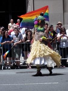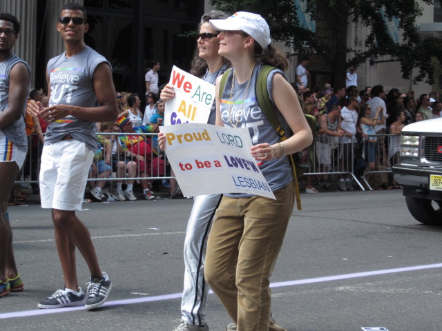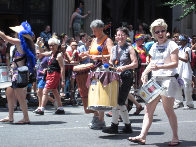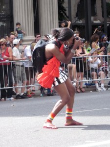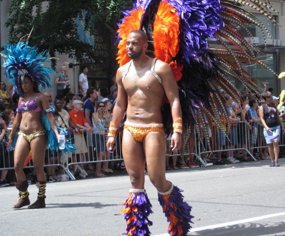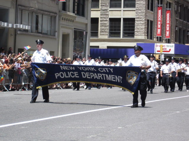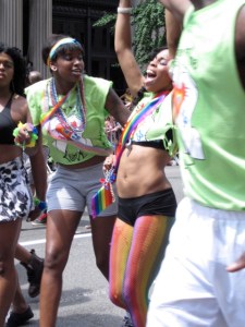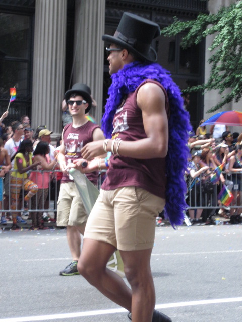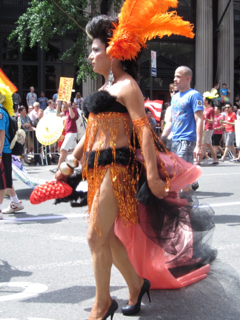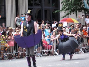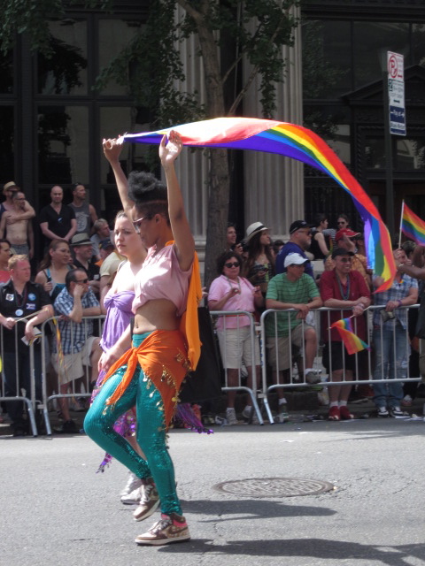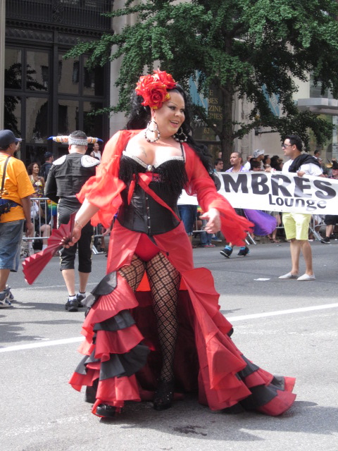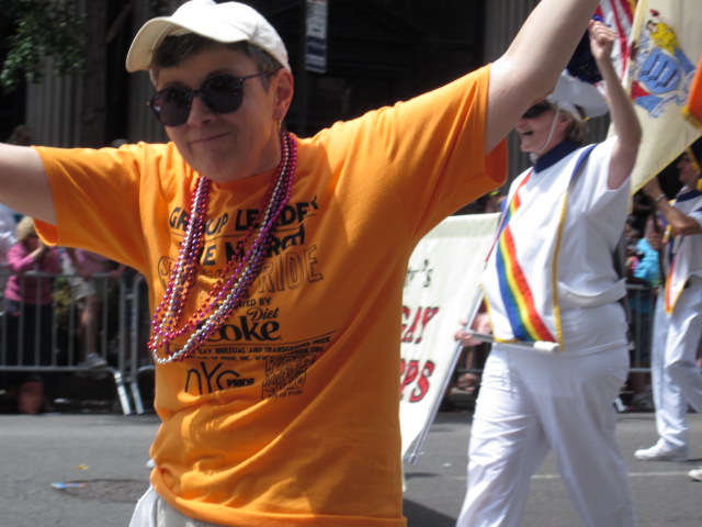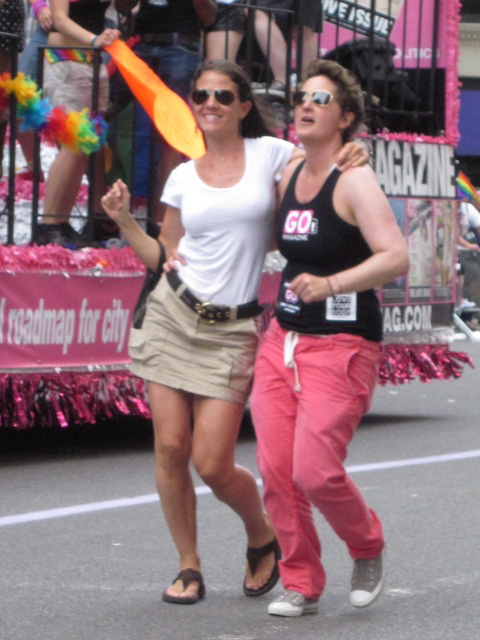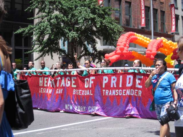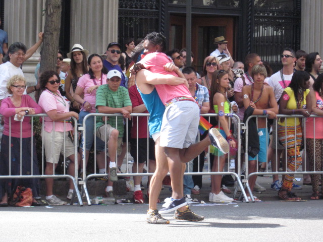 As we have done every year since I started writing Lame Adventures in 2010, Milton and I have watched the Big Apple’s Gay Pride parade from the sidelines.  We watch it from the sidelines because we have not been tagged to serve as the grand marshals.  What a shock!  This year we arrived armed with two cameras, three camera batteries, and his iPhone.  By the time the event ended, approximately five hours after it began, we had three dead batteries and one bar of iPhone power.  We shot over 2000 pictures and missed so many perfect moments due to our digital cameras’ slow shutter speeds.   We now have a whole new appreciation for sports photographers.  My fellow lesbian New Yorker and blogger-bud Natasia over at Hot Femme (who covered the Dyke March on her site) admires our fortitude.  She is unaware that to cap off the event, I broiled my formerly Casper-white left arm.