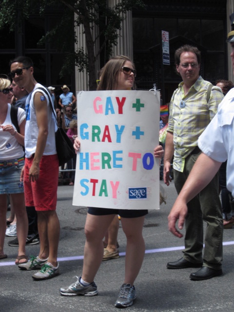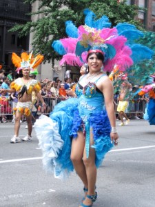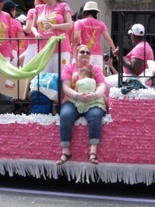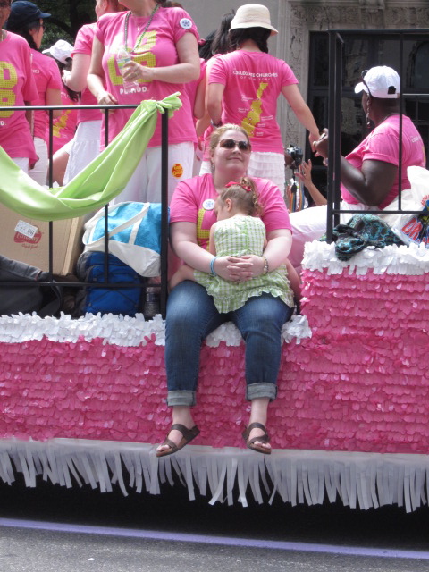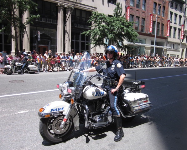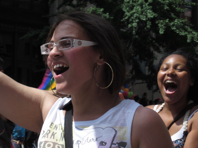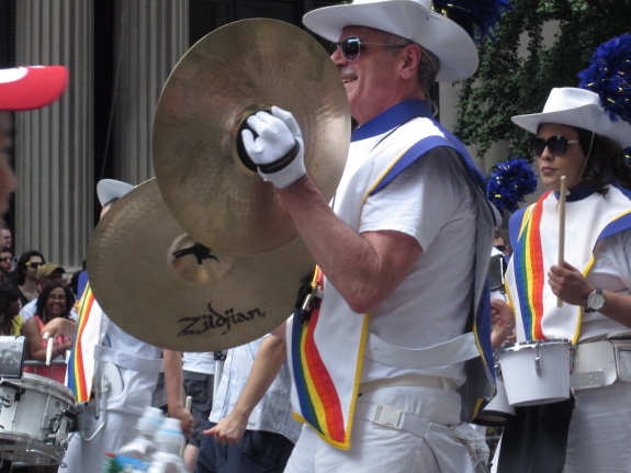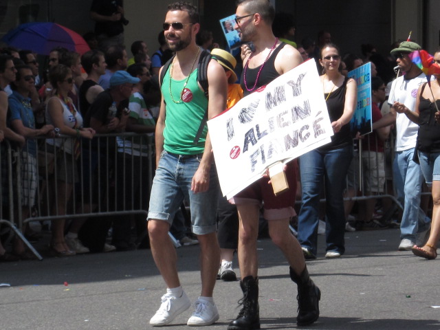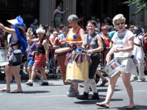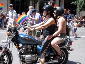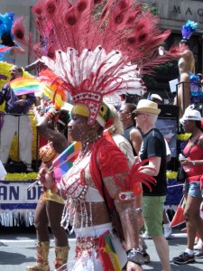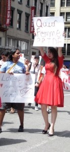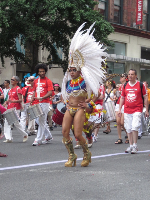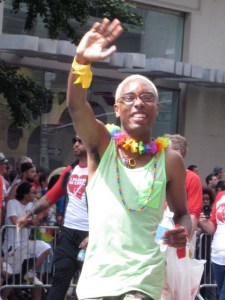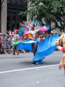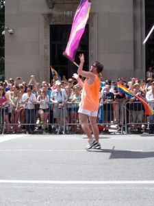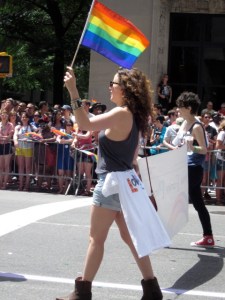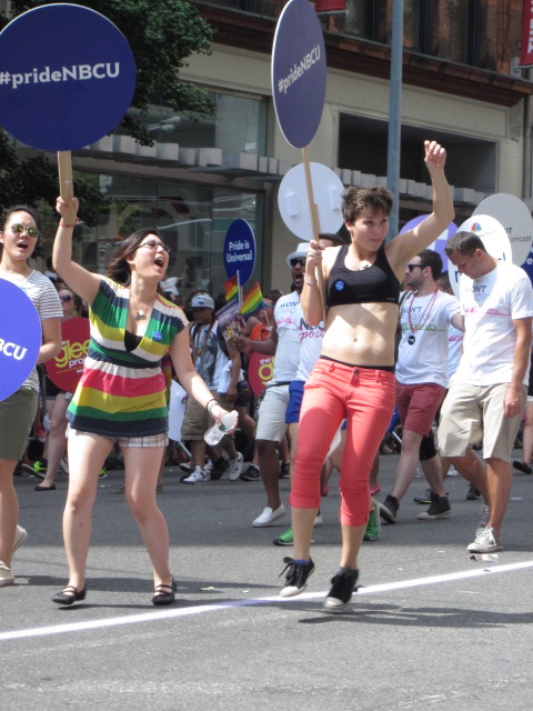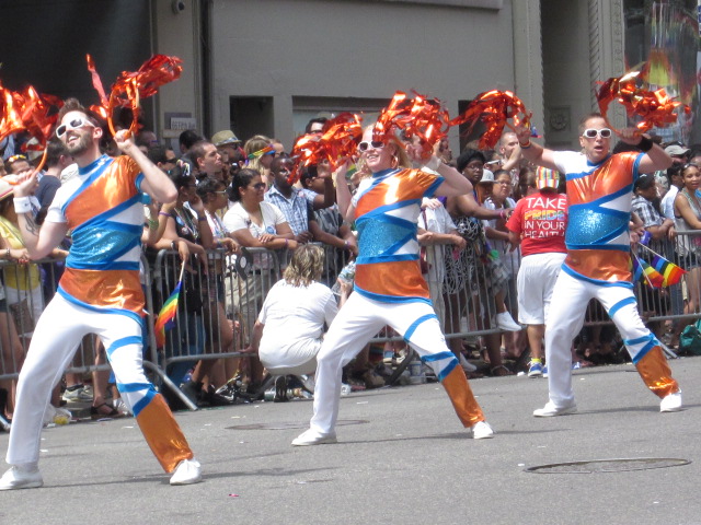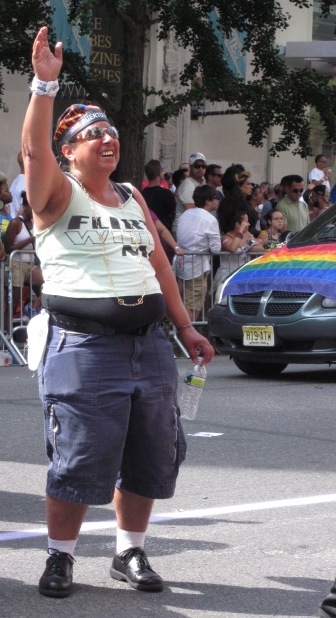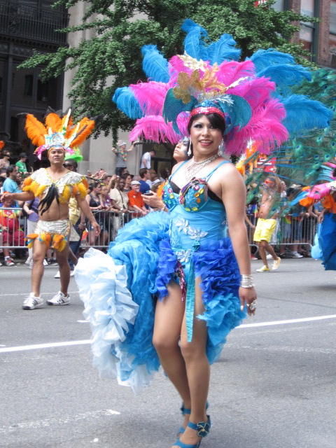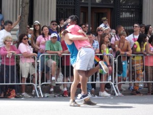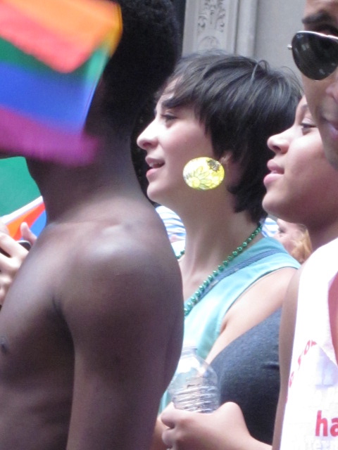 As we have done every year since I started writing Lame Adventures in 2010, Milton and I have watched the Big Apple’s Gay Pride parade from the sidelines.  We watch it from the sidelines because we have not been tagged to serve as the grand marshals.  What a shock!  This year we arrived armed with two cameras, three camera batteries, and his iPhone.  By the time the event ended, approximately five hours after it began, we had three dead batteries and one bar of iPhone power.  We shot over 2000 pictures and missed so many perfect moments due to our digital cameras’ slow shutter speeds.   We now have a whole new appreciation for sports photographers.  My fellow lesbian New Yorker and blogger-bud Natasia over at Hot Femme (who covered the Dyke March on her site) admires our fortitude.  She is unaware that to cap off the event, I broiled my formerly Casper-white left arm.