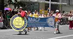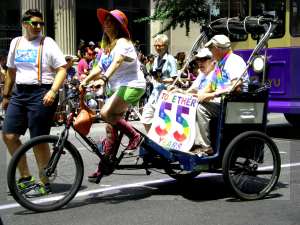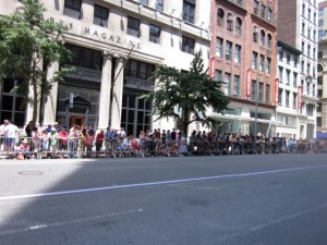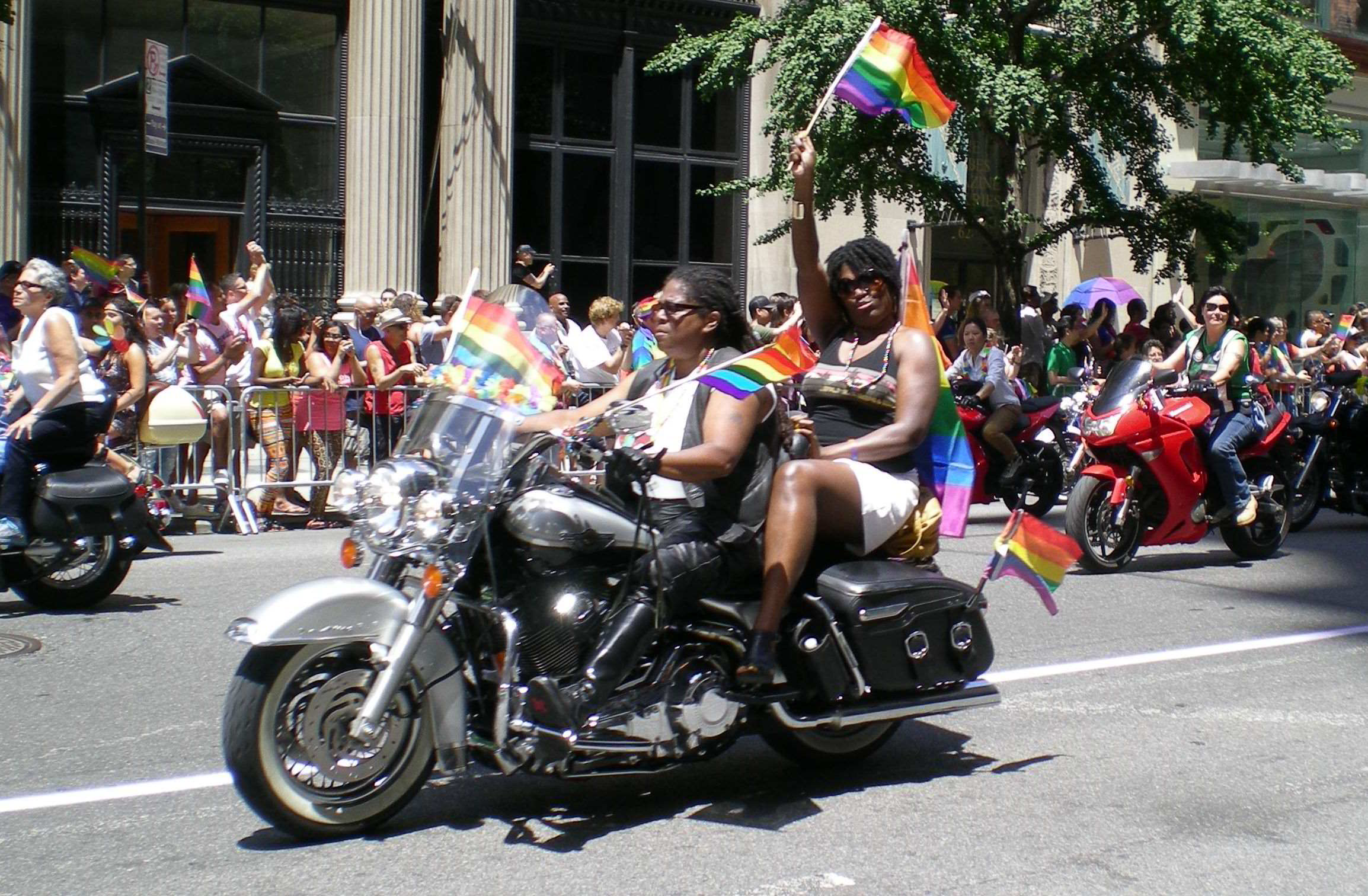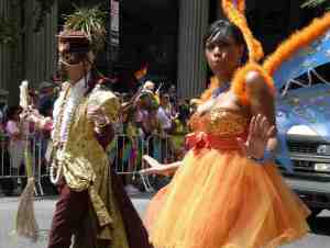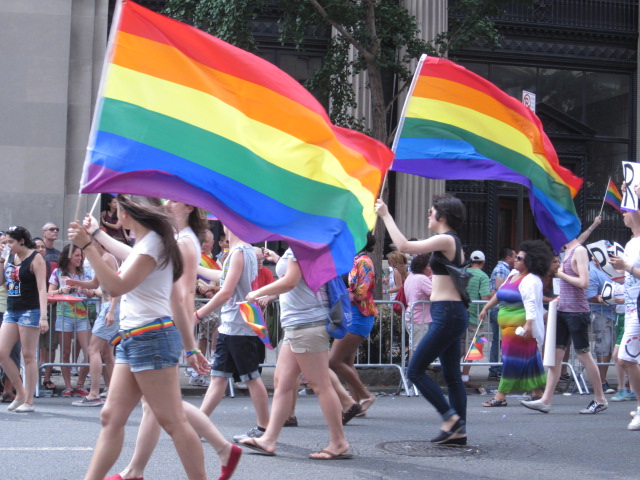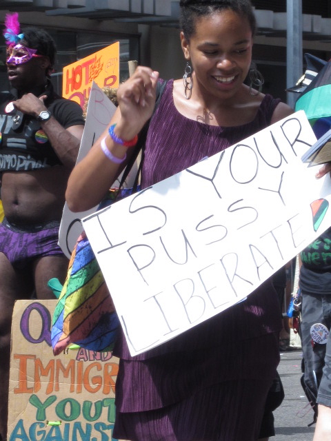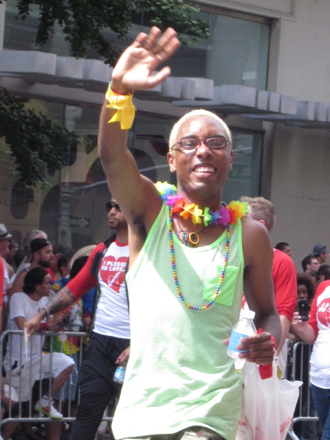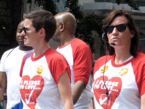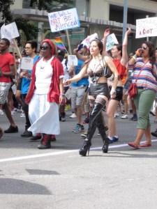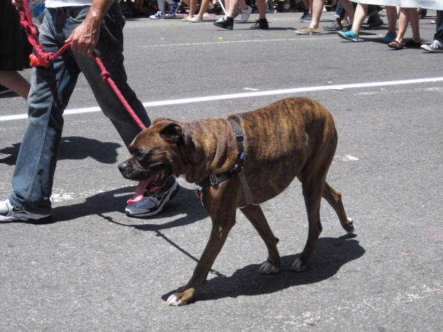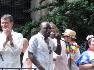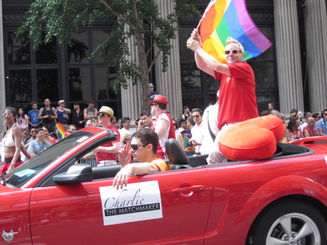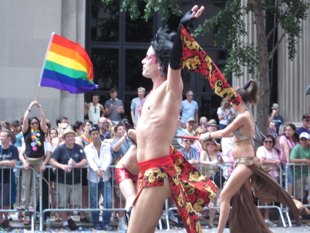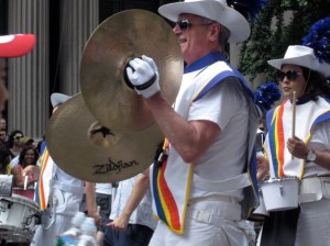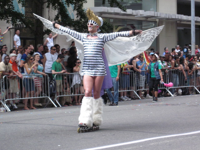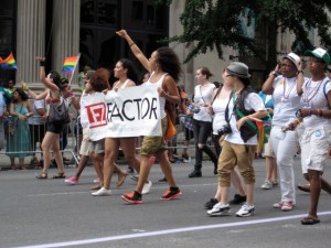 As we have done every year since I started writing Lame Adventures in 2010, Milton and I have watched the Big Apple’s Gay Pride parade from the sidelines.  We watch it from the sidelines because we have not been tagged to serve as the grand marshals.  What a shock!  This year we arrived armed with two cameras, three camera batteries, and his iPhone.  By the time the event ended, approximately five hours after it began, we had three dead batteries and one bar of iPhone power.  We shot over 2000 pictures and missed so many perfect moments due to our digital cameras’ slow shutter speeds.   We now have a whole new appreciation for sports photographers.  My fellow lesbian New Yorker and blogger-bud Natasia over at Hot Femme (who covered the Dyke March on her site) admires our fortitude.  She is unaware that to cap off the event, I broiled my formerly Casper-white left arm.