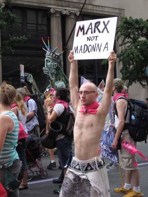 Occupy Wall Street marcher with Madonna issue (must prefer Lady Gaga).
