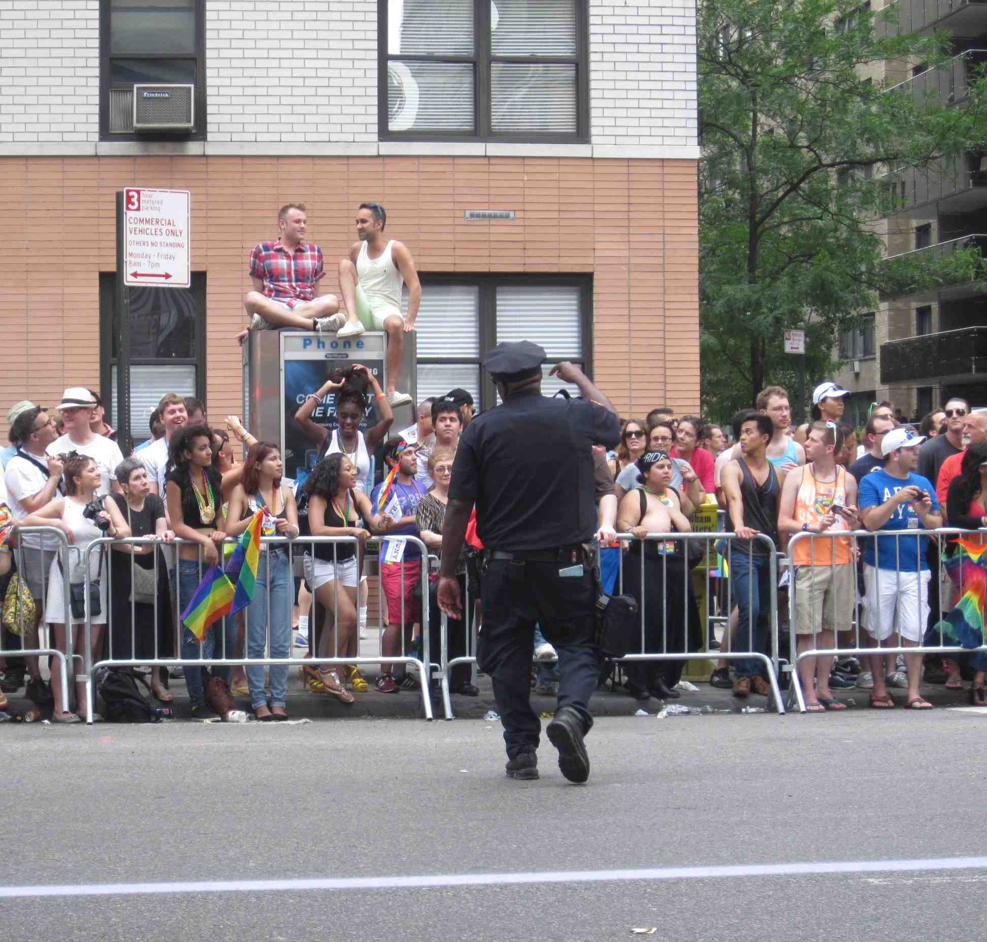 Cop ordering phone booth perching pals to dismount.