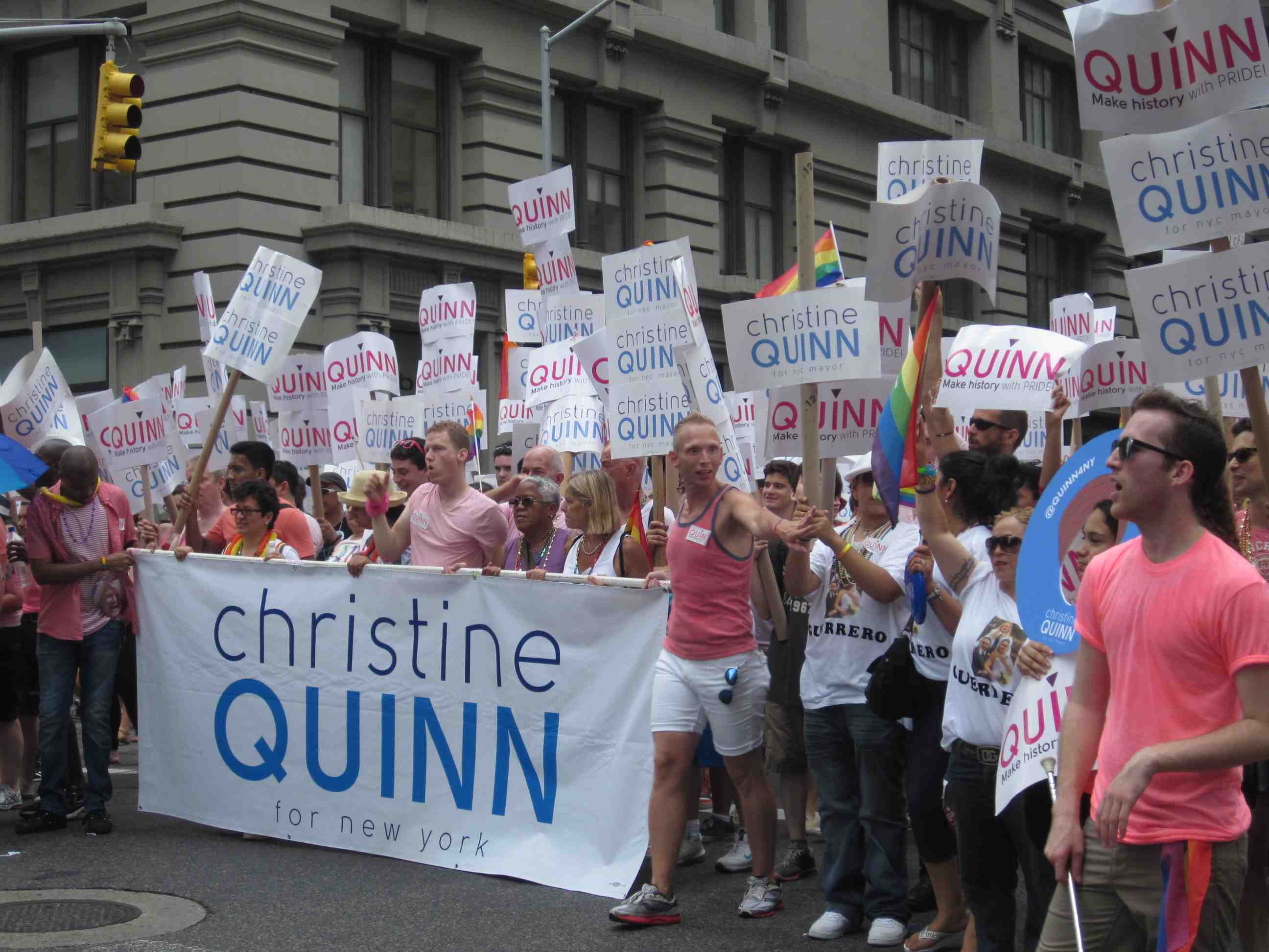 Mayoral candidate Christine Quinn in orange slacks with her spouse Kim Cattullo.