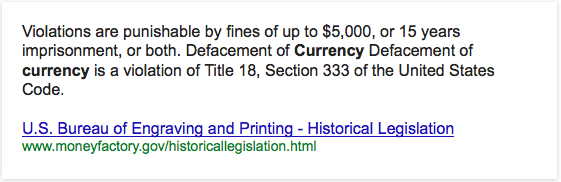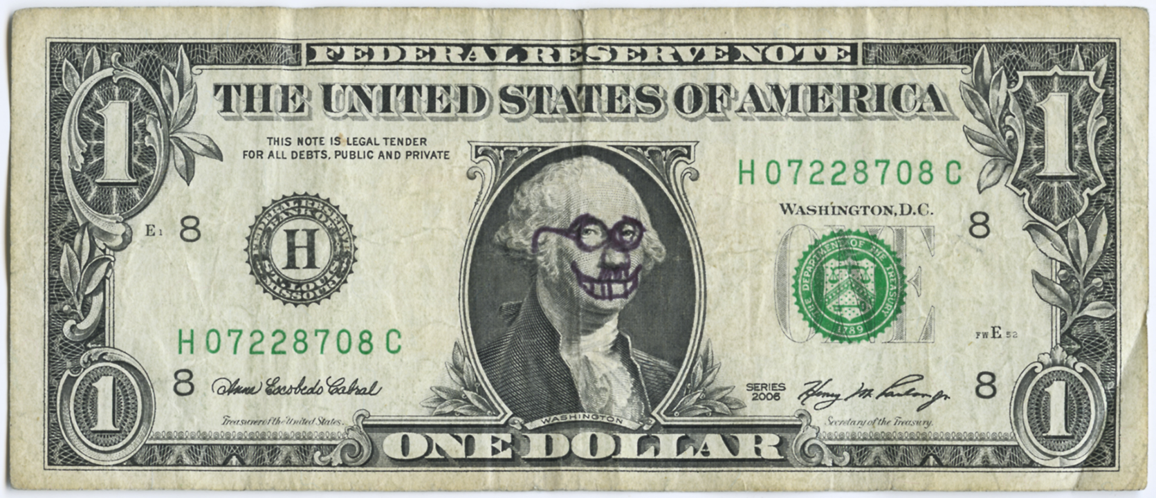 2. A society of at least one repressed artist is, as you have pointed out, defaced our first president’s visage on a series of bills. This is certainly not unheard of, see http://www.wheresgeorge.com/ . I’ve participated in this exercise a few times. At least 3 separate occasions that I can recall.