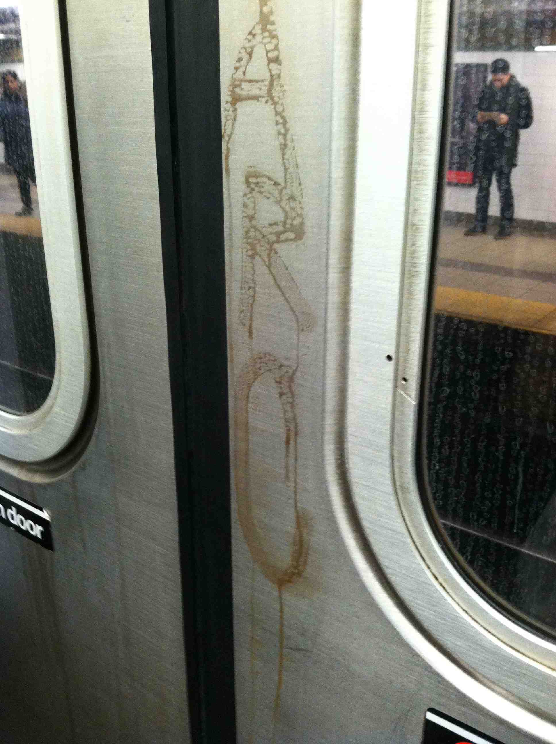 On the way into The Grind on Monday, I recognized the graffiti smeared on the 2 Express train’s door. It’s not like it was very memorable graffiti, nor was it in the forefront of my thoughts since whenever it was that I last saw it, a period of time between 24 hours and 24 days earlier. For some reason, it stuck in my head.