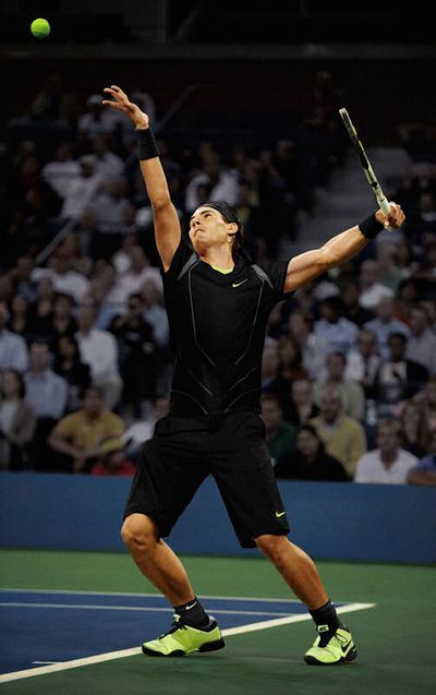 This year at the US Open, Rafa has introduced some serious improvements. He’s added a powerful serve to his game, and he has also made some welcome style adjustments. He has a new haircut, and a basic black outfit trimmed in yellow. Milton, in fashion police mode, has been pregnant with comment about Rafa’s makeover. Recently, we shared this email exchange:
