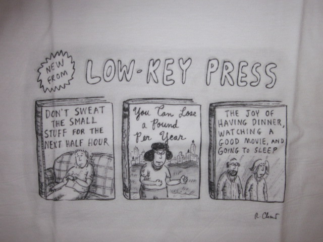 Prior to going I researched the more than 1000 exhibitors to see if any might be open to my brand of wit. I focused on nine publishers and three literary agencies. Once at Javits, I saw a crowd waiting in the lobby for the show to open at 9 A.M. Someone assumed that I was press, which struck me as odd, but I was wearing this Roz Chast cartoon tee shirt that must have given the false impression that I have a career.