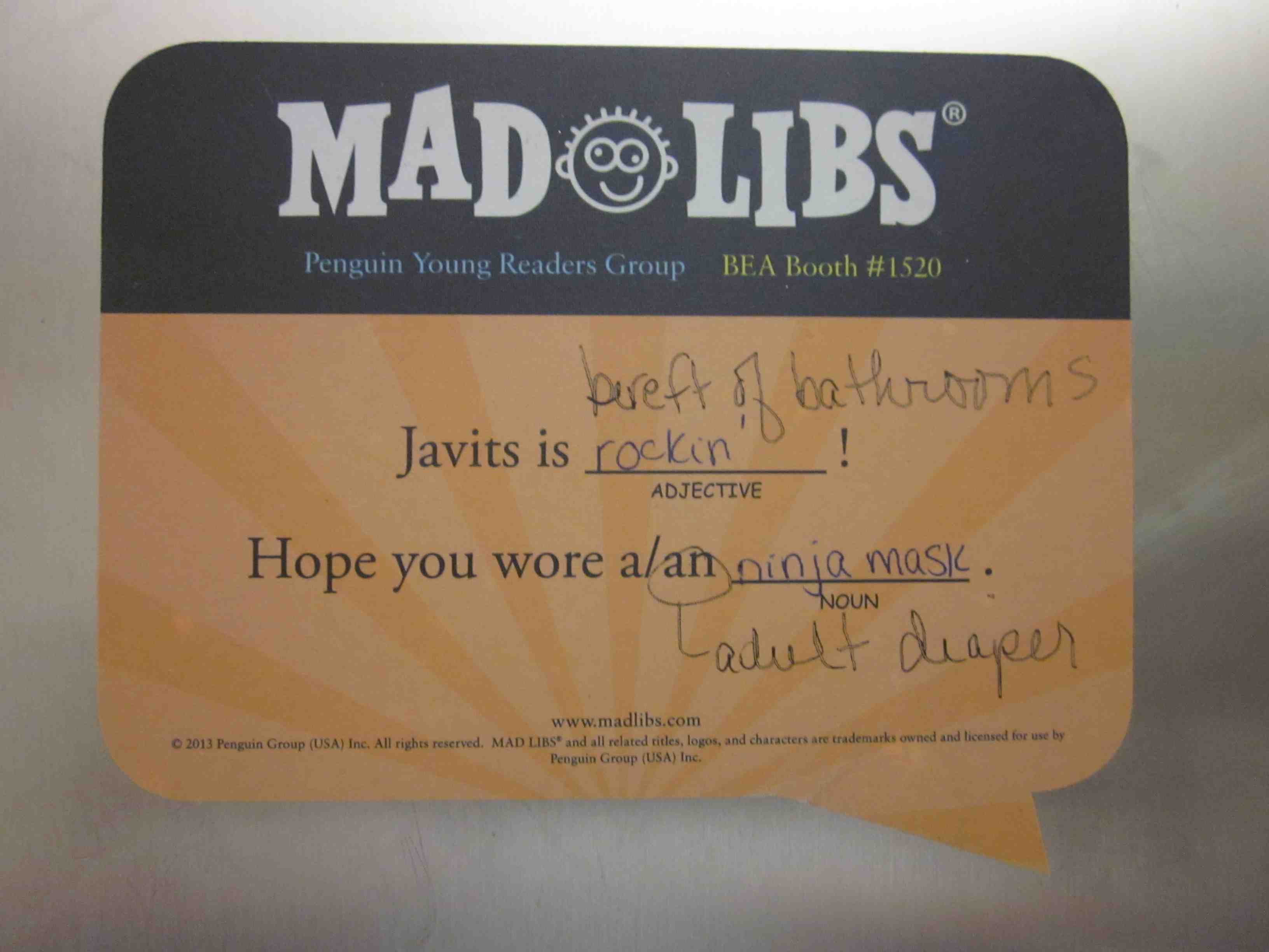 Before leaving at the end of the long day, I visited the bathroom, but resisted the temptation to shill my book to the attendant there. The loo was plastered with Mad Libs stickers. Pictured below is the one that was inside my stall’s door.
